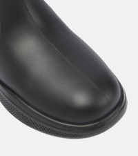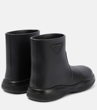 Prada can always be counted on for timeless staples. The Mellow ankle boots are entirely made of black rubber, stamped with triangular logos on the sides, and set on textured soles. Product Details - Lining: rubber - Toe shape: round toe - Upper: rubber - Comes with a box - Sole: rubber insole and sole - Designer color name: Nero - Made in Italy - Item number: P00657730 Size & Fit - Fits large to size - we recommend trying one size smaller - European sizes - 3cm-1" platform (size EU 38) - 4cm-1.5" wedge heel (size EU 38)