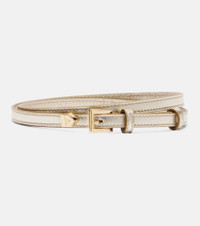 Prada embodies modern sophistication, blending timeless Italian craftsmanship with an innovative spirit. Made in Italy from metallic leather, this belt features a slim silhouette with a gold-tone square buckle. Product Details - Material: lamb leather - Lining: leather - Made in Italy - Color: silver - Designer color name: Gold/Silver - Includes: dust bag - Item number: P01146155 Size & Fit - Width 1cm-0.5" - Buckle width 1,6cm-0.5"