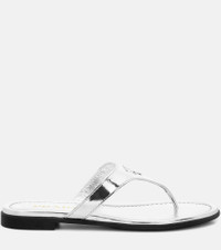 Embrace the enduring appeal of the T-bar sandal silhouette with this vacation-ready pair from Prada. They've been made in Italy from high-shine silver leather and are finished with embossed logo detailing on the bridges. Product Details - Toe shape: round open toe - Lining: leather - Sole: leather insole, rubber sole - Upper: calf leather - Made in Italy - Designer color name: Argento - Item number: P00435597 Size & Fit - True to size - European sizes - 2,0cm-1" heel (size EU 38)