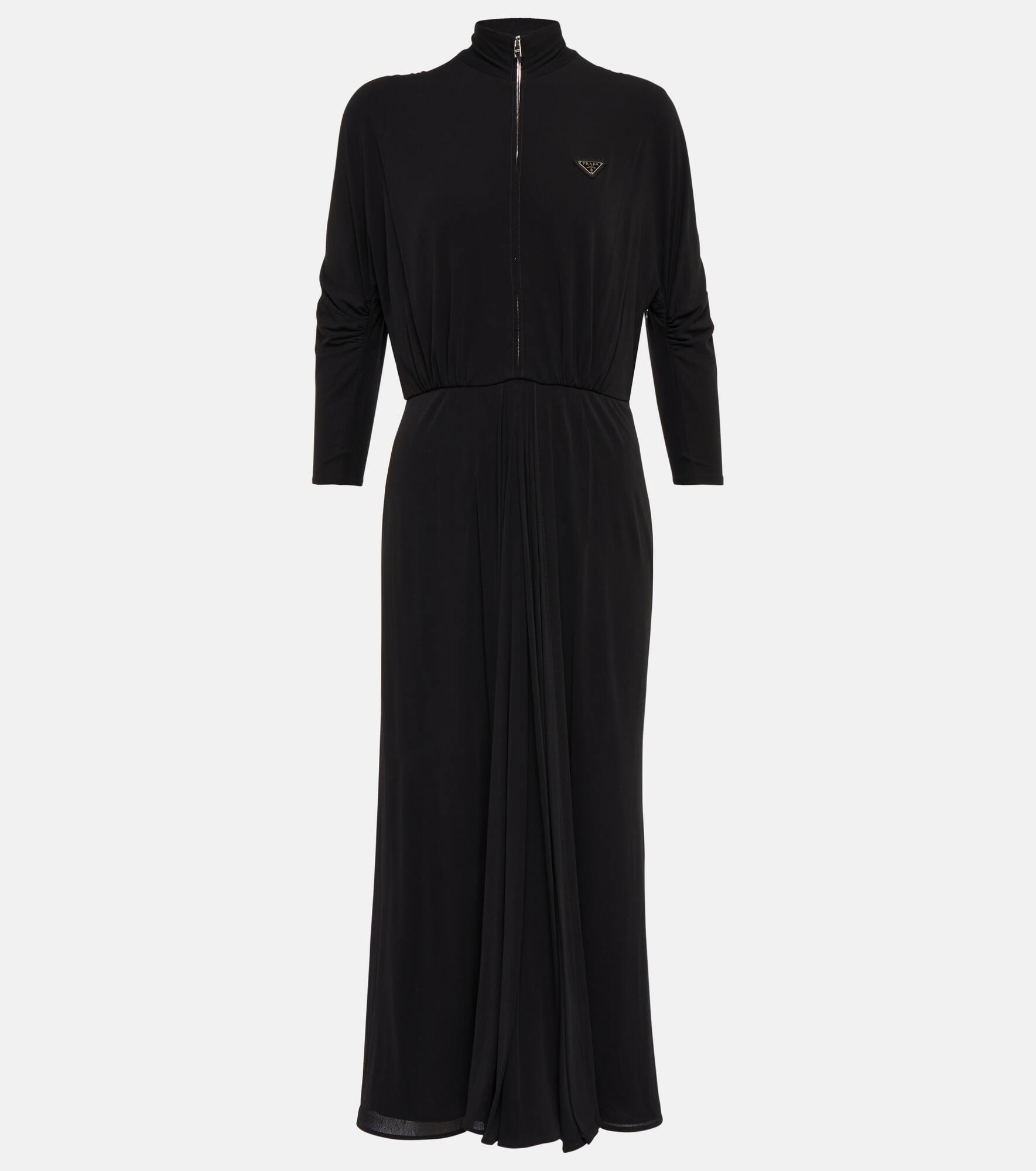 This black midi dress exemplifies the directional yet wearable aesthetic of Prada. Accented with an enameled logo plaque, the design features a partial zipped front, a mockneck collar, and ruched, three-quarter length sleeves. Product Details - Made in Italy - Material: 100% viscose - Care instructions: dry clean - Designer color name: Nero - Closure: zipped front - Item number: P00779302 Size & Fit - Fits large to size - we recommend trying one size smaller - Cinched waist - The model seen in the picture is 178cm-5'10" and wearing a size IT 40