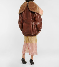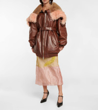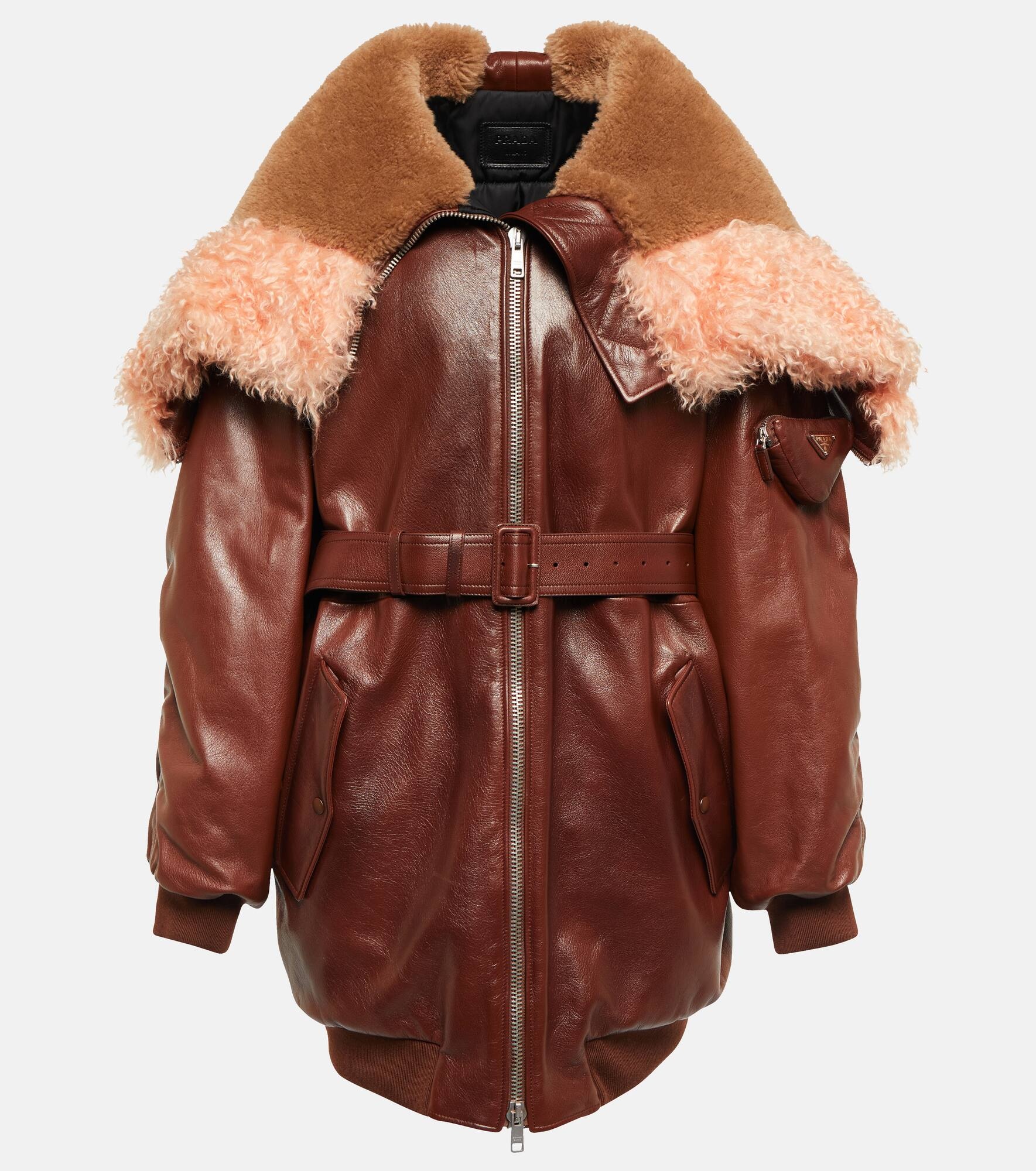 In an insulating and distinct blouson silhouette, this coat from Prada embodies the brand's cutting-edge approach to outerwear. Made from weighty lamb leather, the belted design has an oversized collar with contrasting shearling and mohair trims and a two-way zipper for versatile styling. Product Details - Material III: 81% wool, 17% polyamide, 2% elastane - Made in Italy - Care instructions: specialist clean - Designer color name: Tobacco - Closure: two-way zipped front - Filling: 100% polyester - Lining: 100% polyamide (recycled), fully lined - Material II: 80% mohair, 20% polyamide - Material: 100% lamb leather - Pockets: flap pockets, internal pockets - Elasticated waistband, Elasticated cuffs - Item number: P00726405 Size & Fit - Fits large to size - we recommend trying one size smaller - Designed for an extremely oversized fit - Dropped shoulders - The model seen in the picture is 178cm-5'10" and wearing a size XS