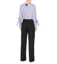 Versatile in both color and silhouette, these trousers from Prada serve as the perfect canvas for which to display the label's inimitable playfulness. Crafted in Italy from mohair and wool, the high-waisted design has a tapered straight leg for a masculine-inspired look. Coordinate yours with an oversized shirt to enliven your 9-to-5. Product Details - Pocket lining: 100% cupro - Closure: zipper fly, button and hook fastenings - Belt loops - Designer color name: Nero - Made in Italy - Pockets: side slit pockets, back pockets - Material: 84% wool, 16% mohair - Care instructions: dry clean - Item number: P00335328 Size & Fit - Fits large to size - we recommend trying one size smaller - Wide-leg - High-waisted - Unhemmed for tailoring - The model seen in the picture is 178cm-5'10" and wearing a size IT 38