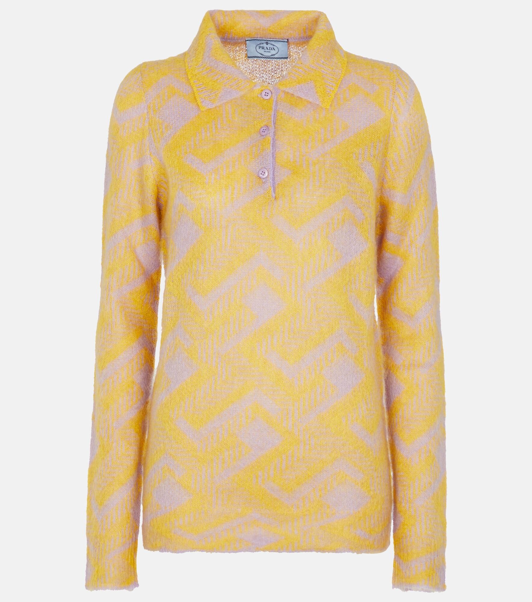 Covered in a lavender and orange geometric motif, this polo sweater from Prada is an artful addition to your knitwear. It's made from mohair and wool-blend yarns that are lightweight yet incredibly warm and soft. Product Details - Made in Italy - Closure: partially buttoned front - Material: 67% mohair, 28% polyamide, 5% wool - Designer color name: Glicine+Mostarda - Care instructions: dry clean - Item number: P00594898 Size & Fit - True to size - Designed for a loose fit - Falls to the hip - The model seen in the picture is 178cm-5'10" and wearing a size IT 40