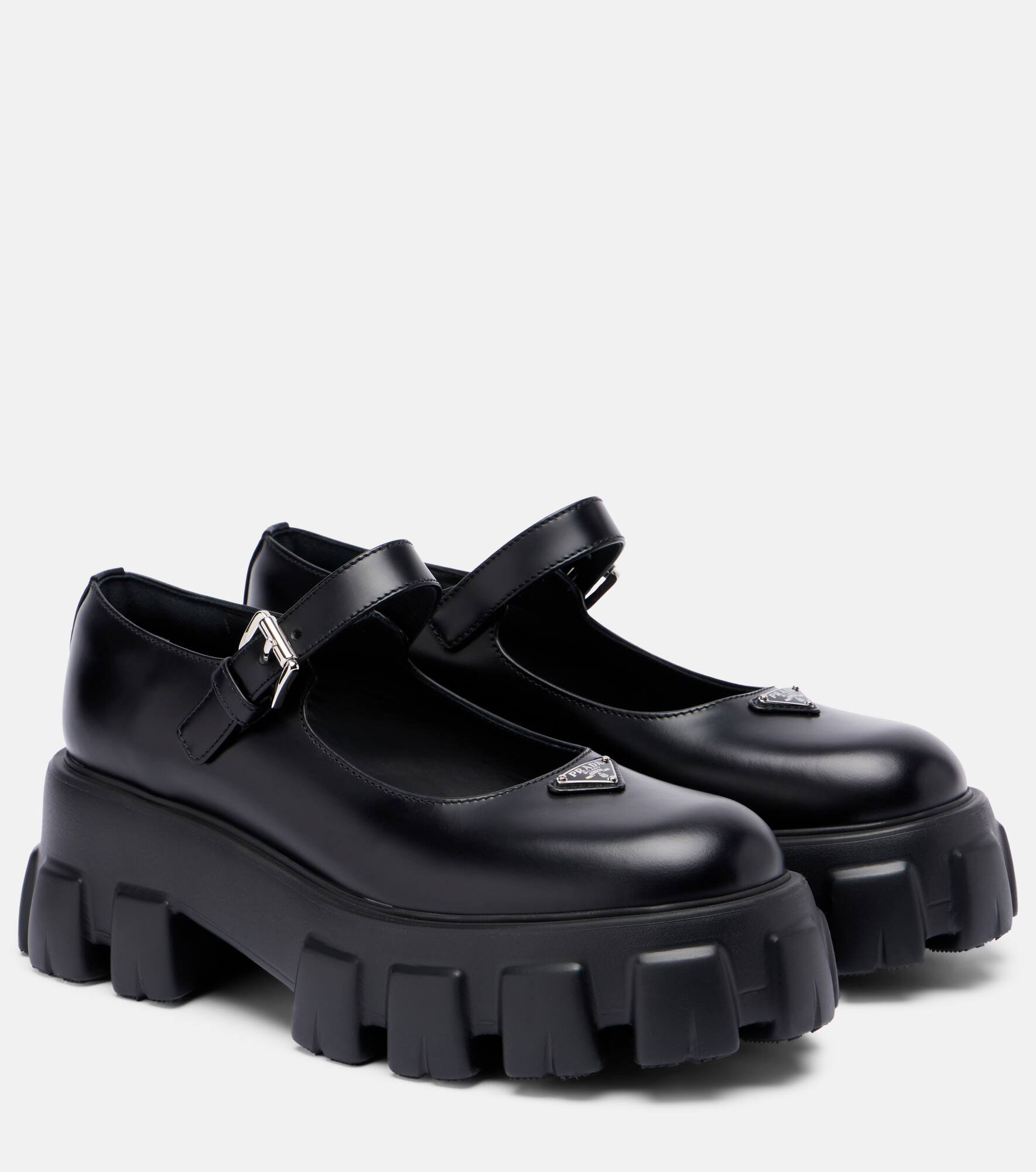 Prada embodies modern sophistication, blending timeless Italian craftsmanship with an innovative spirit. Crafted from leather, the Monolith Mary Jane flats sit atop chunky soles and feature the unmistakable triangle logo on the uppers. Product Details - Upper: leather - Lining: leather - Sole: leather insole, rubber sole - Toe shape: round toe - Made in Italy - Includes: shoe box, dust bag - Designer color name: Black - Item color: black - Hardware color: silver - Closure: buckle fastening - Item number: P01125562 Size & Fit - Fits slightly large to size - we recommend trying a half size smaller - European sizes - 5cm-2" platform (size EU 38) - 6cm-2.5" wedge heel (size EU 38)
