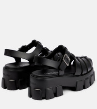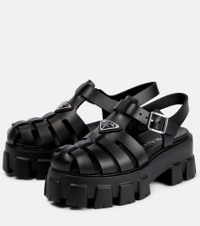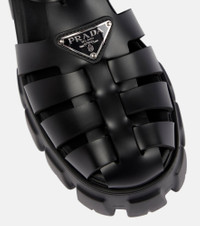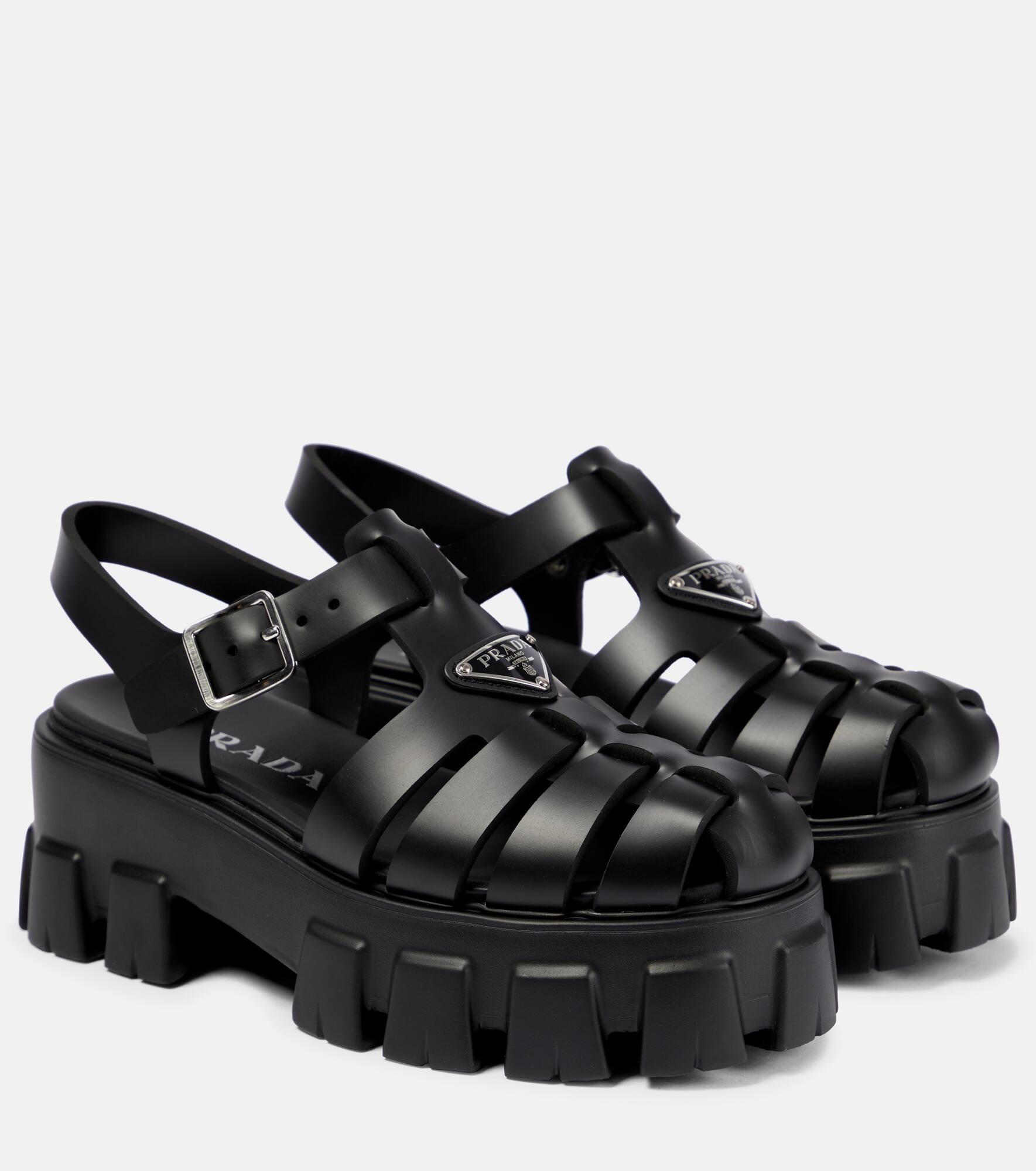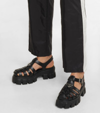 These platform sandals from Prada are slated to become the latest footwear-favorite from the brand. Designed with the iconic Monolith rubber sole, they have cage-like straps that are finished with an enameled logo plaque. Product Details - Upper: rubber - Lining: rubber - Sole: leather insole, rubber sole - Toe shape: round toe - Made in Italy - Includes: shoe box - Designer color name: Nero - Closure: buckle-fastening ankle strap - Hardware color: silver - Item number: P00637837 Size & Fit - True to size - Half sizes please take the next size down - European sizes - 6,5cm-2.5" heel (size EU 38) - 4,5cm-2" platform (size EU 38)