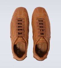 Prada takes Italian heritage into a distinctly modern direction with a streamlined and fashion-forward approach. Crafted from supple leather, the Montecarlo Re-Edition 2005 sneakers feature sporty and sleek silhouettes with high-frequency printed logos on the uppers. Product Details - Upper: lamb leather - Lining: leather - Sole: leather insole, leather and rubber sole - Toe shape: square toe - Made in Italy - Includes: shoe box, dust bag - Designer color name: Caramel - Item color: brown - Closure: lace-up - Item number: P01060841 Size & Fit - True to size - UK sizes