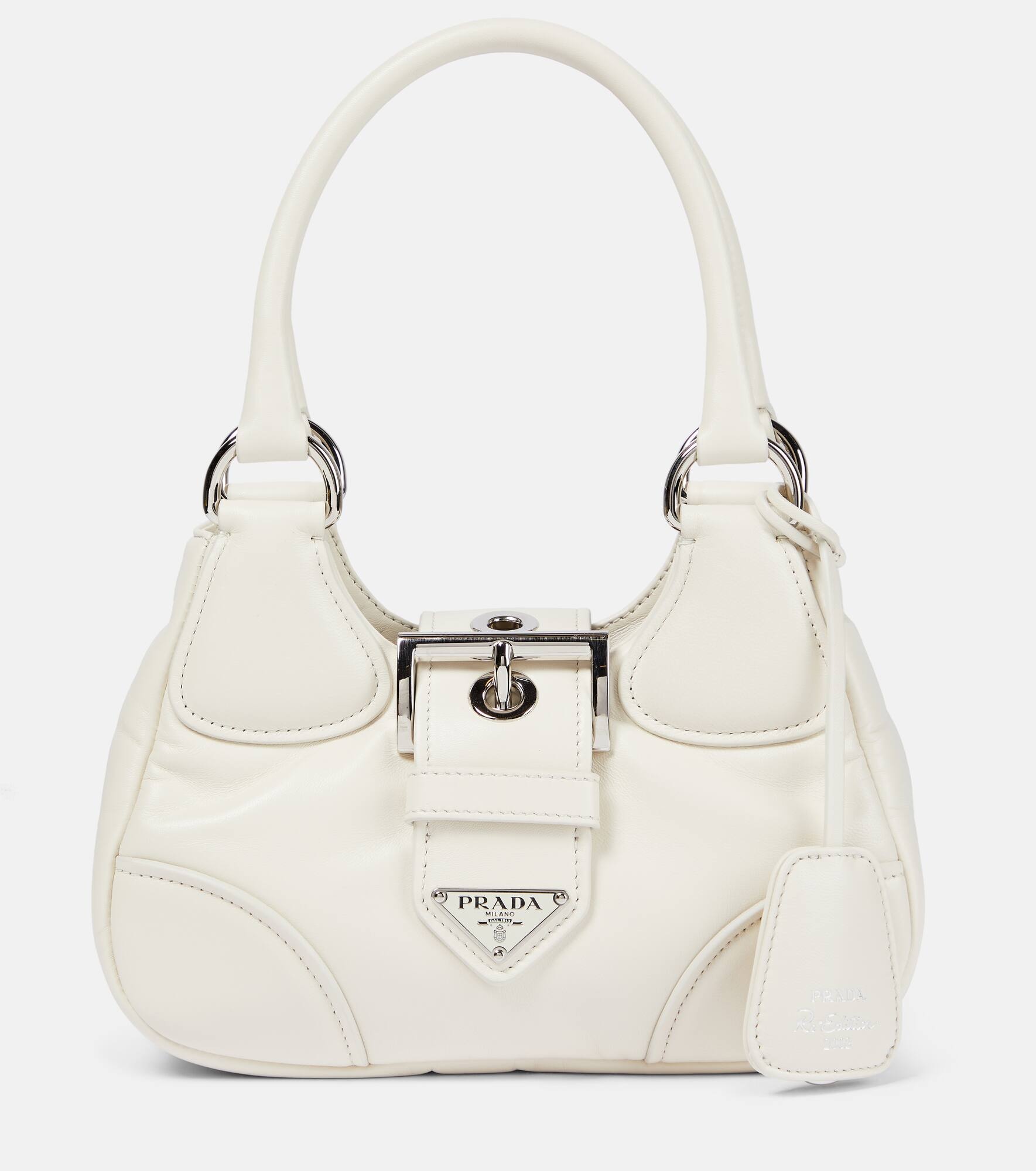 Prada’s Moon shoulder bag is characterized by its maxi buckle closure adorned with a tonal triangle logo. Made from padded nappa leather, the small design has a structured silhouette with top handles and a detachable keychain. Product Details - Internal details: internal zipped pocket, leather lining - Made in Italy - Designer color name: Bianco - Comes with dust bag, Comes with a box - Closure: magnetic-tab fastening - Detachable, adjustable shoulder strap, Top handles - Material: leather - Item number: P00819379 Size & Fit - Width 23cm-9" - Min. height 12cm-4.5" - Max. height 17cm-6.5" - Max. depth 8,5cm-3.5" - Length of handles 33cm-13" - Min. length shoulder strap 102cm-40" - Max. length shoulder strap 112cm-44"