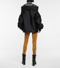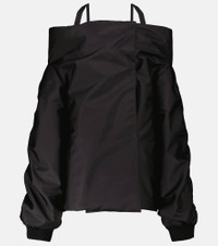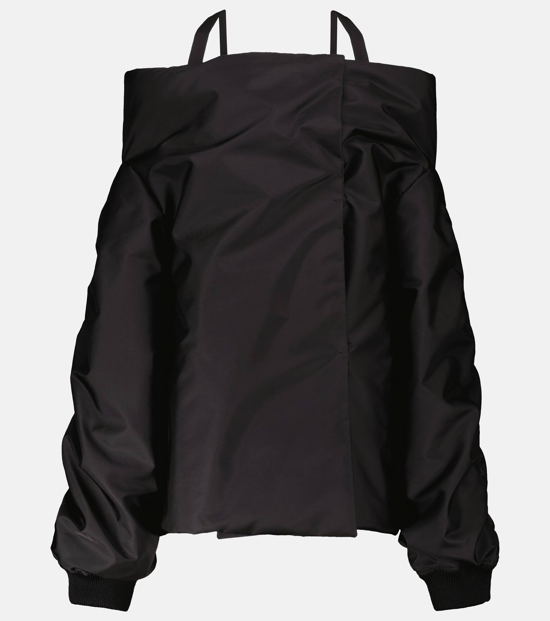 This black off-the-shoulder jacket debuted at Prada's Fall/Winter '21 runway show. Made in Italy from the brand's signature nylon that's padded for insulation, it has an oversized silhouette with extra-long sleeves that have knit cuffs. Product Details - Details: 100% calf leather - Made in Italy - Material: 100% polyamide - Designer color name: Nero - Filling: 100% polyester - Care instructions: hand wash - Lining: 100% polyamide, fully lined - Pockets: zipped pocket, internal pockets - Adjustable shoulder straps - Item number: P00594880 Size & Fit - True to size - Designed for an extremely oversized fit - For a closer fit, we recommend taking one size down - Dropped shoulders - Falls to the hip - The model seen in the picture is 178cm-5'10" and wearing a size IT 40