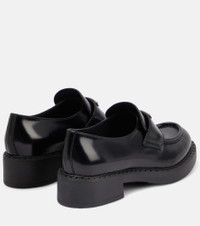 Trust Prada to present a pair of loafers that somehow speak to both the past and present at once. Made from polished leather and set on platform soles, these topstitched loafers feature the triangle logo that has formed a part of fashion history forever. Product Details - Upper: calf leather - Lining: leather - Sole: leather insole, rubber sole - Toe shape: round toe - Made in Italy - Includes: shoe box, dust bags - Designer color name: Nero - Item number: P00527372 Size & Fit - True to size - Slightly narrow - European sizes - 4cm-1.5" heel (size EU 38) - 2,5cm-1" platform (size EU 38)