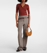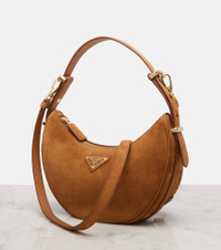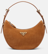 Prada takes Italian heritage into a distinctly modern direction with a streamlined and fashion-forward approach. The Prada Arque shoulder bag arrives in a timeless brown suede, designed with a classic half-moon silhouette and gold-toned hardware. Product Details - Material: calf leather (suede) - Lining: calf leather - Made in Italy - Designer color name: Brown - Item color: brown - Adjustable top handle, Detachable shoulder strap - Closure: zipped top - Hardware color: gold - Internal details: internal slot pocket - Includes: dust bag - Item number: P01083896 Size & Fit - Height 9cm-3.5" - Width 24cm-9.5" - Depth 5.5cm-2" - Length of handles 45/35cm-17.5/14"