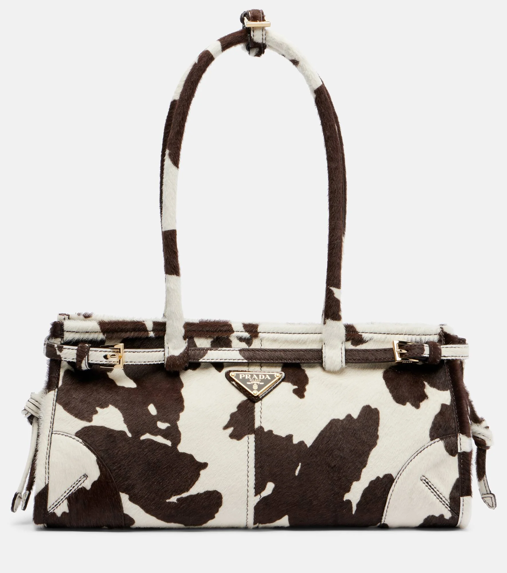 Prada takes Italian heritage into a distinctly modern direction with a streamlined and fashion-forward approach. Crafted from cow-printed calf hair, the Prada Bonnie Medium tote bag features an elongated silhouette and the iconic triangle logo. Product Details - Material: calf hair - Lining: fabric - Made in Italy - Color: brown - Designer color name: White - Closure: zipped top - Shoulder straps, Detachable, adjustable shoulder strap - Internal details: internal zipped pocket - Includes: dust bag - Item number: P01151365 Size & Fit - Height 16cm-6.5" - Min. width 30cm-12" - Max. width 32cm-12.5" - Depth 11cm-4.5" - Length shoulder strap 55cm-21.5"