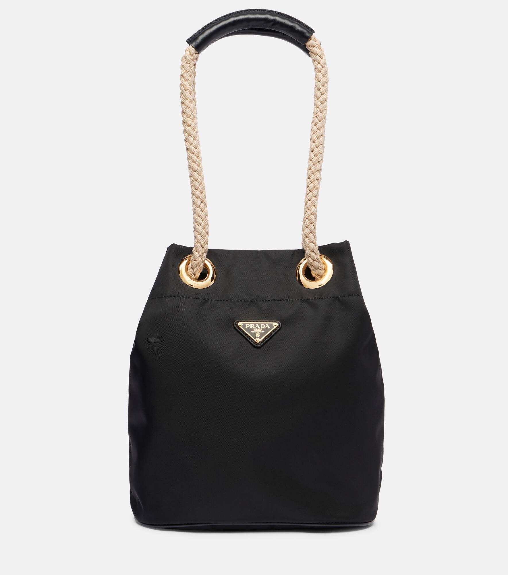 Offering a more sustainable take on a signature fabric, Prada’s Re-Nylon products are made from regenerated ocean plastic waste. Made from the signature material, the Prada Mariner bucket bag is complete with woven rope-like handles and gold-toned hardware. Product Details - Material: nylon - Lining: fabric - Made in Italy - Designer color name: Black - Item color: black - Includes: dust bag - Details: calf leather - Shoulder straps - Internal details: internal zipped pocket - Closure: open top - Hardware color: gold - Item number: P01083902 Size & Fit - Height 25cm-10" - Width 23,5cm-9.5" - Depth 14cm-5.5" - Length of handles 67cm-26.5"