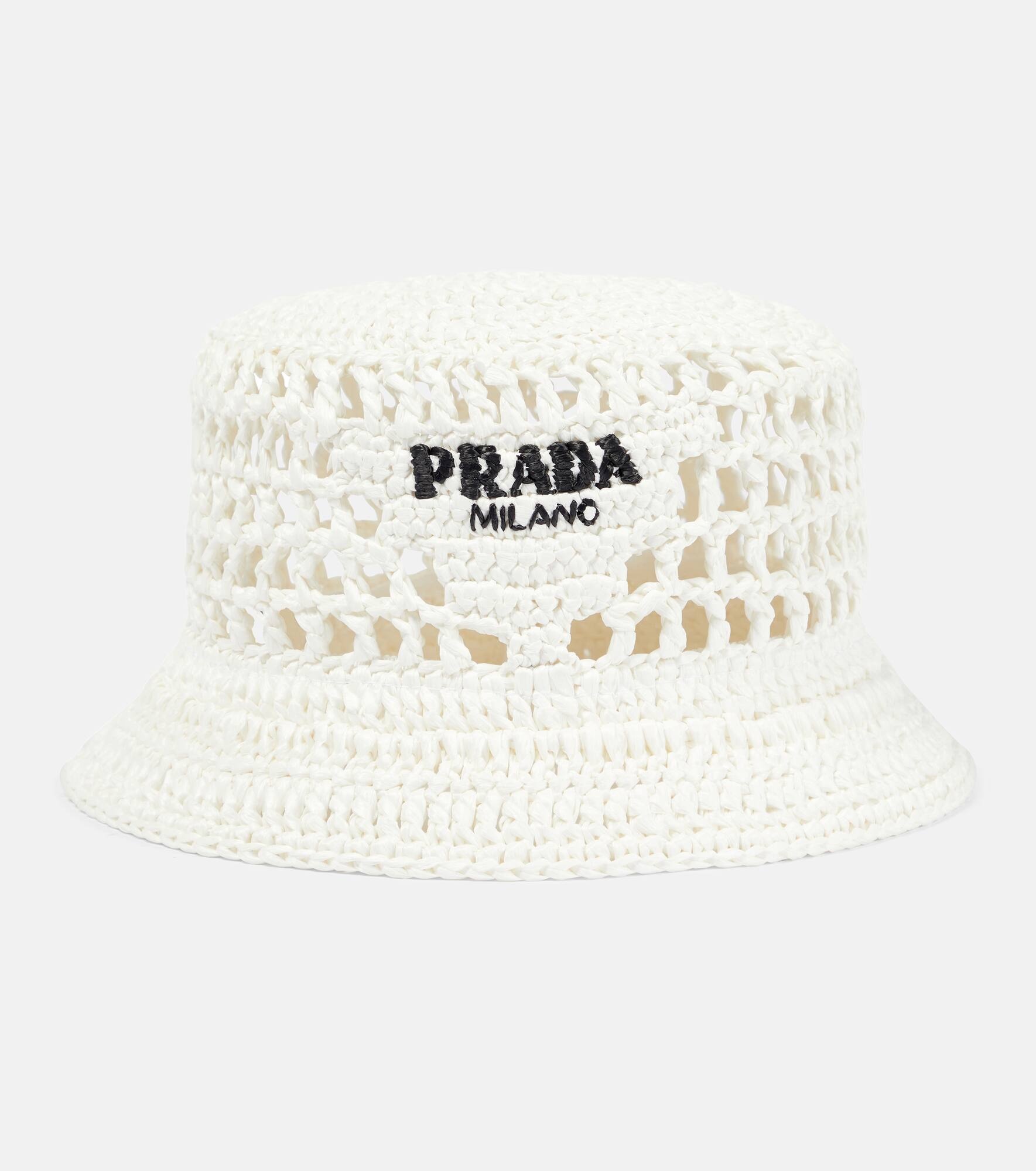 The bucket hat is synonymous with Prada's summer aesthetic, and this iteration is a sophisticated take on the '90s-inspired style. It's woven into a raffia-effect, including the label's unmissable logo. Product Details - Material: 100% viscose - Care instructions: dry clean - Comes with garment bag - Made in Italy - Item number: P00655382 Size & Fit - Circumference size S 57cm-22.5" - Circumference size M 58cm-23" - Circumference size L 59cm-23" - Width of brim 5,5cm-2"