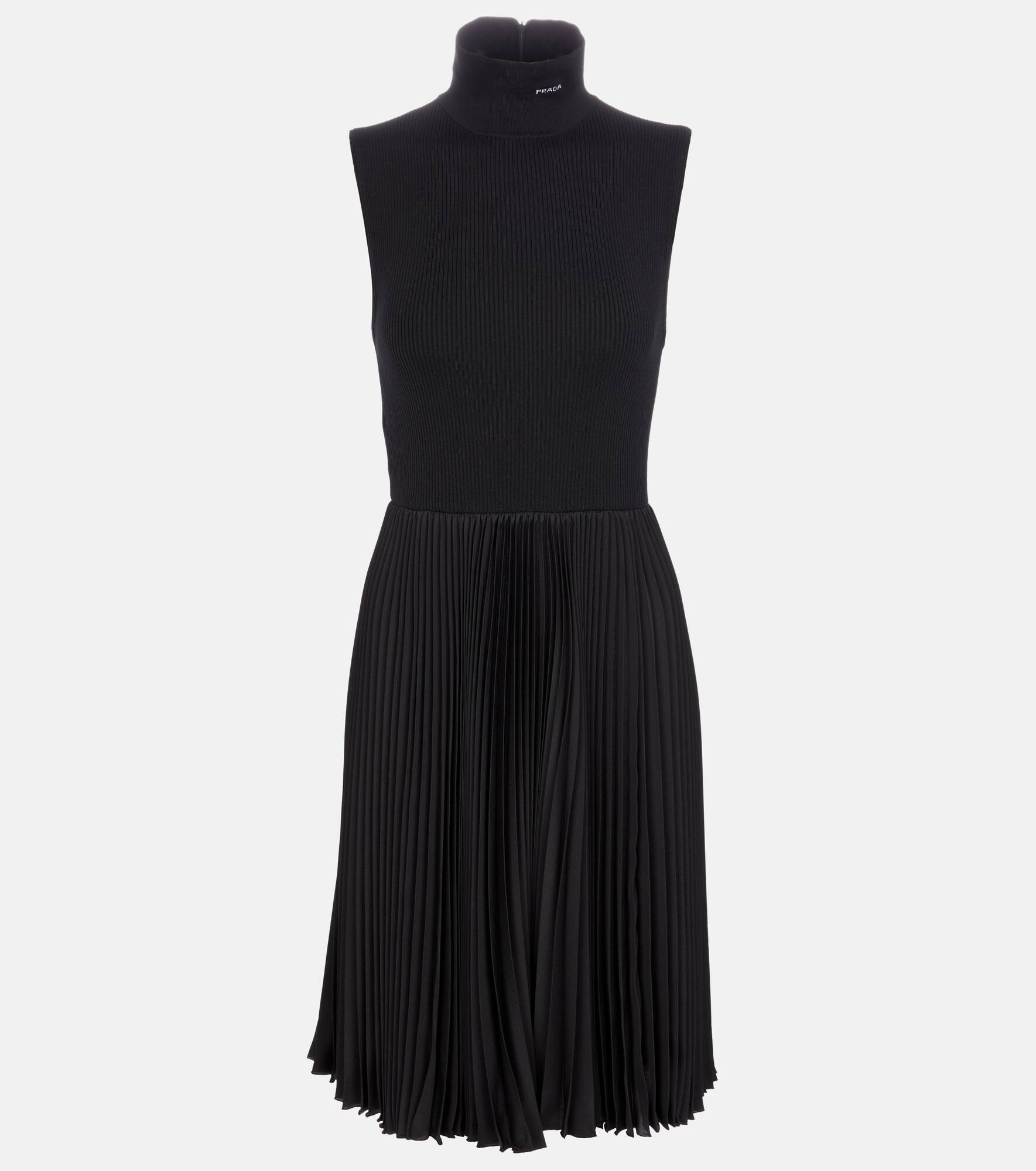 From Miuccia Prada and Raf Simons' history-making Prada collection, this black knee-length dress brings the strengths of both iconic designers to the forefront. The high, logo-emblazoned neck of the wool top speaks to fans of the Belgian designer, while the pleated skirt is rendered in the Italian label's signature Re-Nylon. Complete the look with a pair of the house's Opanca pumps. Product Details - Made in Italy - Material: 100% virgin wool - Care instructions: dry clean - Designer color name: Nero+Nero - Material II: 100% polyester - Item number: P00571904 Size & Fit - True to size - Cinched waist - The model seen in the picture is 178cm-5'10" and wearing a size IT 40