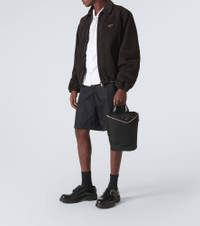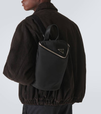 Prada's iconic triangular logo adorns this backpack. Made from the label's Re-Nylon fabric with leather trims, it has a single shoulder strap and a zipped top. Product Details - Trim: calf leather - Top handle, Adjustable shoulder strap - Designer color name: Nero - Internal details: internal zipped pocket, fabric lining, centre slot compartment - Made in Italy - Color of fastening: silver - Closure: two-way zipped top - Material: fabric - Item number: P00673572 Size & Fit - Height 29cm-11.5" - Diameter 20cm-8" - Adjustable shoulder strap - Min. length shoulder strap 60cm-23.5" - Max. length shoulder strap 107cm-42"