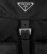 A style star of the '80s that is just as covetable today, Prada's Re-Nylon backpack is an It-bag that won't lose its appeal. This medium-sized style has multiple compartments sealed with buckled saffiano leather straps, and comes with a coordinating pouch that can be carried separately. Product Details - Material: nylon (recycled) - Lining: nylon - Made in Italy - Designer color name: Nero - Detachable zipped pouch - Trim: leather - Top handle, Adjustable shoulder straps - Internal details: internal zipped pocket, internal slot pocket - Closure: buckle fastening , drawstring top - Color of fastening: silver - Front pockets - Includes: dust bag - Hardware color: silver - Item number: P00589227 Size & Fit - Height 31cm-12" - Width 30cm-12" - Depth 15cm-6" - Min. length shoulder strap 53cm-21" - Max. length shoulder strap 87cm-34.5" - Clutch height 9cm-3.5" - Clutch width 18,5cm-7.5"