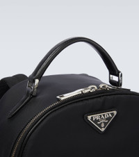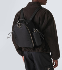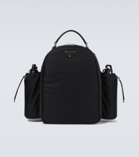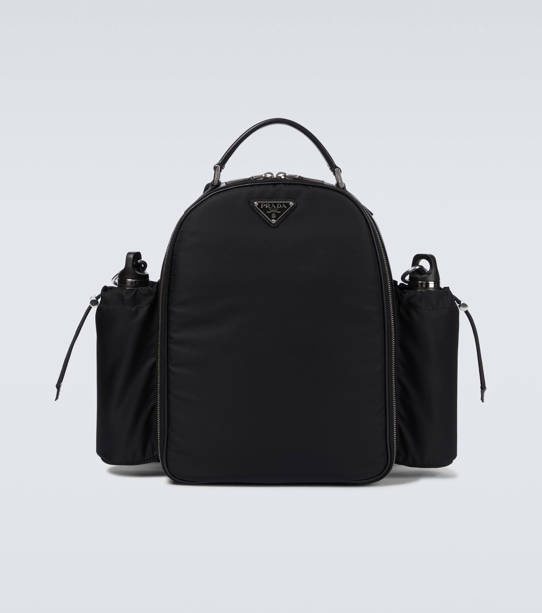 Made from the brand's signature Re-Nylon fabric, this black backpack from Prada is accented by two large pouches at either side, has a zipped fastening, a top handle, and adjustable straps. Product Details - Trim: calf leather - Top handle, Adjustable shoulder straps - Designer color name: Nero - Made in Italy - Comes with dust bag - Color of fastening: silver - Closure: two-way zipped top - Material: fabric - Internal details: fabric lining, three internal compartments - Color of strap: black - Item number: P00554175 Size & Fit - Height 33cm-13" - Min. width 25cm-10" - Max. width 40cm-15.5" - Depth 15cm-6" - Min. length shoulder strap 43cm-17" - Max. length shoulder strap 82cm-32.5"