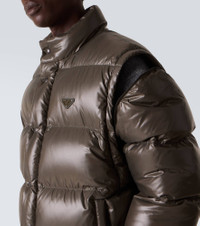 Offering a more sustainable take on a signature fabric, Prada’s Re-Nylon products are made from regenerated ocean plastic waste. Crafted from the signature fabric, this down jacket features a puffer style with detachable sleeves. Product Details - Material: 100% polyamide (recycled) - Care instructions: dry clean - Made in Italy - Designer color name: Green - Item color: green - Filling: 90% down, 10% feathers - Filling II: 100% polyester (recycled) - Contains non-textile parts of animal origin - Closure: zipper, snap-button fastenings - Pockets: zipped pockets, internal pockets - Cuff: buttoned - Drawstring at the hem for adjustable fit - Detachable sleeves - Item number: P01127331 Size & Fit - True to size - Straight fit - Adjustable hem - Non-stretchy fabric - Falls below the hip - Height of model is 192cm-75.5" and wears a size L