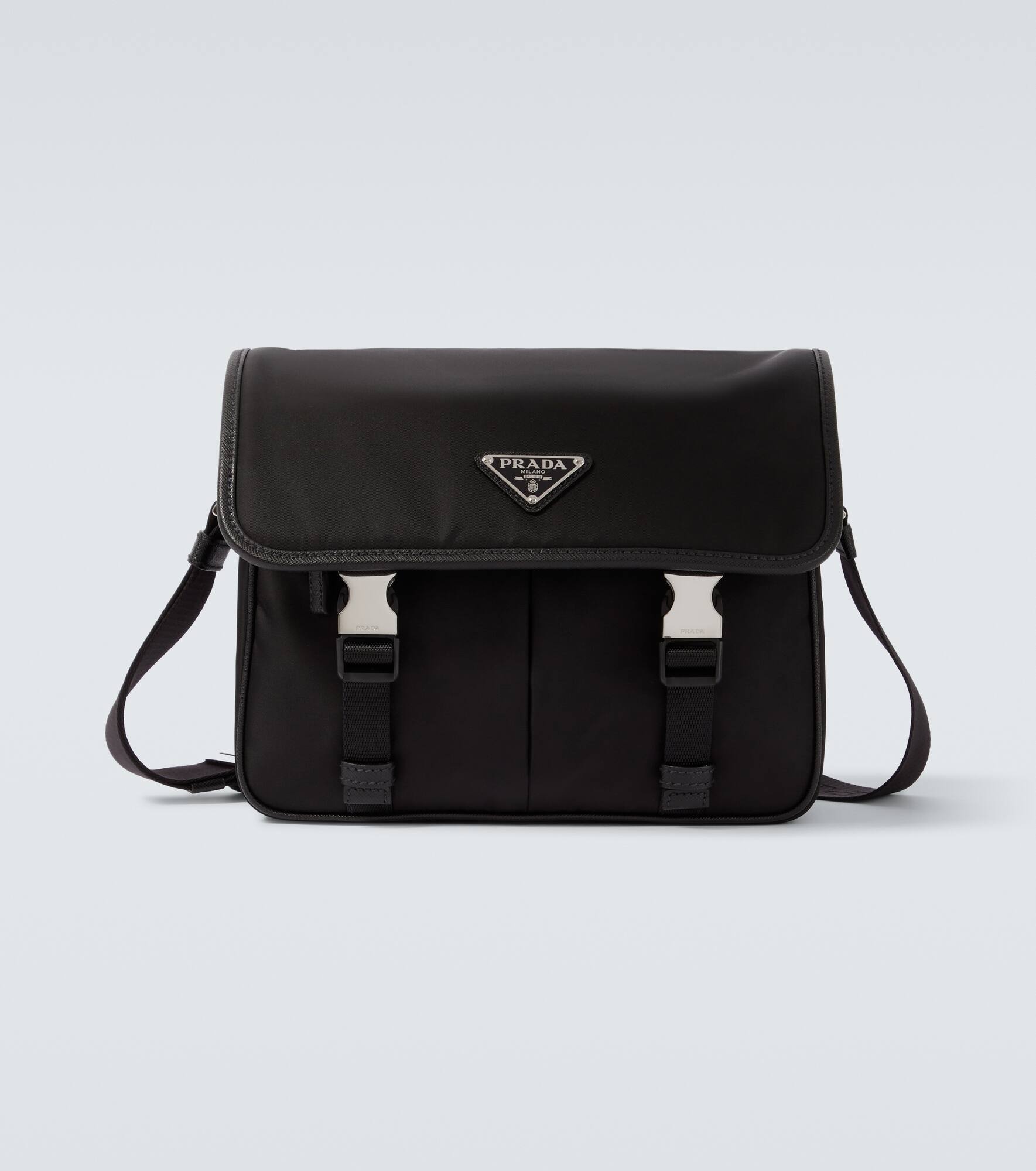 This functional shoulder bag from Prada is made from the brand's signature Re-Nylon and accented with leather trims. The design features an adjustable shoulder strap and is detailed with the iconic triangle logo. Product Details - Material: nylon, leather - Lining: fabric - Made in Italy - Designer color name: Black - Item color: black - Hardware color: silver - Closure: buckle fastening - Internal details: internal zipped pocket, two internal compartments - Adjustable shoulder strap - Includes: dust bag - Item number: P01068867 Size & Fit - Height 20,5cm-8" - Width 25,5cm-10" - Depth 10cm-4" - Adjustable shoulder strap - Max. length shoulder strap 136cm-53.5"