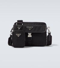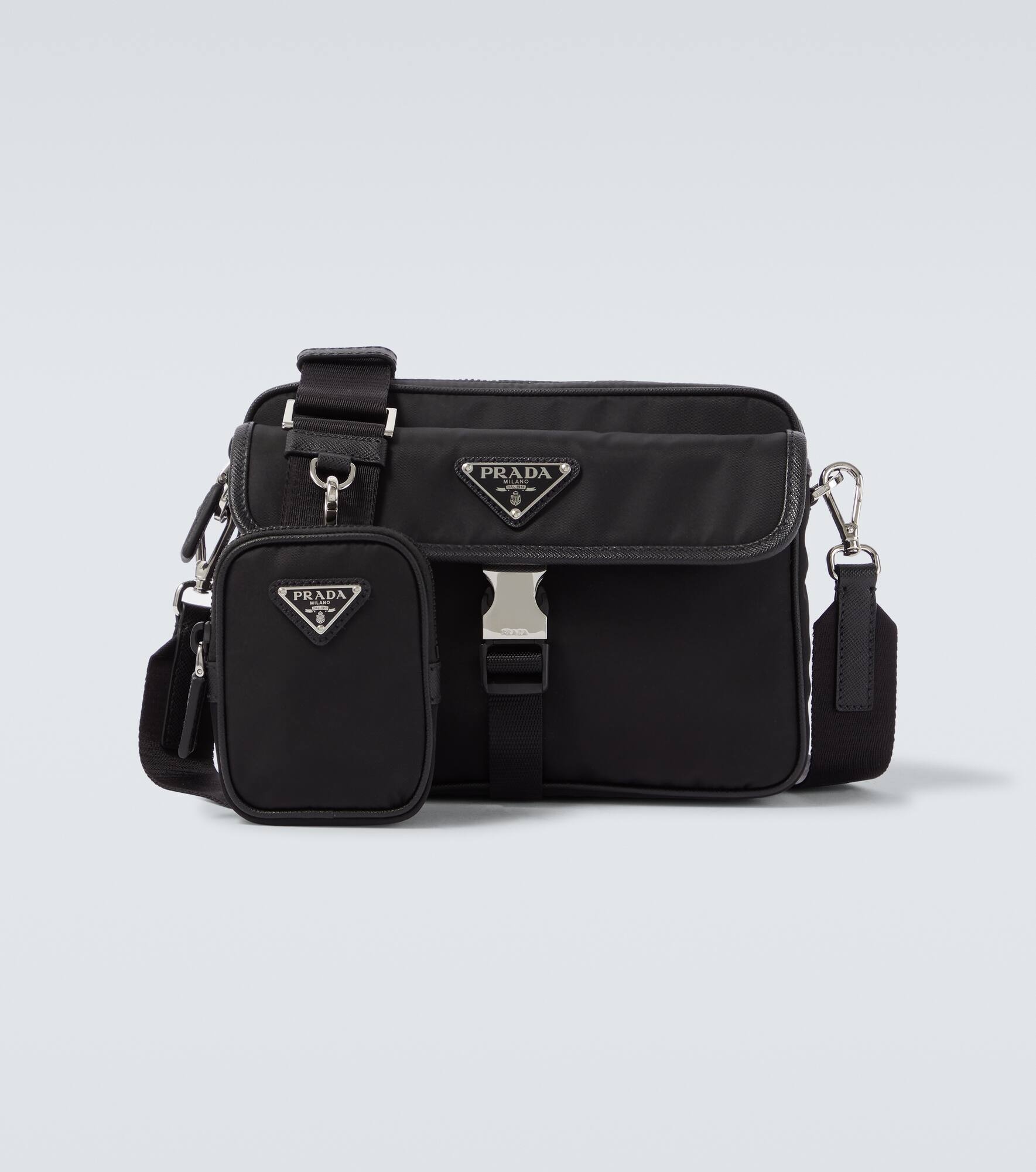 This shoulder bag brings together two of Prada's signature materials: a durable Re-Nylon structure is accented with supple Saffiano leather trims. The design features a functional flap pocket, a detachable strap, and a small pouch. Product Details - Material: nylon - Lining: nylon - Made in Italy - Designer color name: Black - Item color: black - Closure: buckle fastening , zipped top - Front pocket under flap - Internal details: zipped centre compartment - Detachable zipped pouch - Detachable shoulder strap - Includes: dust bag - Hardware color: silver - Item number: P01086377 Size & Fit - Height 15cm-6" - Width 22cm-8.5" - Depth 6.5cm-2.5" - Adjustable shoulder strap - Max. length shoulder strap 144cm-56.5" - Clutch height 10cm-4" - Clutch width 7.5cm-3"