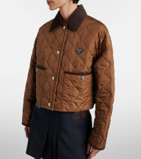 This quilted jacket from Prada is crafted from the brand's signature Re-Nylon—a sustainable fabric made from recycled ocean plastics. This piece features corduroy trims and is finished with the iconic metal triangle logo. Product Details - Material: 100% polyamide (recycled) - Care instructions: dry clean - Made in Italy - Designer color name: Sughero - Item color: brown - Filling: 70% polyester (recycled), 30% polyester - Details: 100% cotton - Insert: 100% leather - Contains non-textile parts of animal origin - Closure: snap-buttoned front - Pockets: snap-buttoned pockets - Item number: P01061955 Size & Fit - True to size - Dropped shoulders - Designed for a loose fit - Non-stretchy fabric - Slightly cropped - The model seen in the picture is 178cm-5'10" and wearing a size IT 40