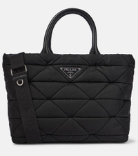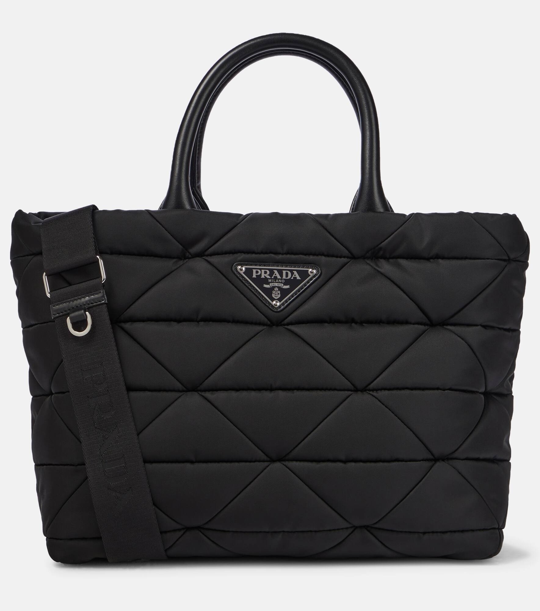 This black Re-Nylon tote from Prada is both a sustainable and stylish choice. It's diamond-quilted and filled with light padding for a soft touch. Leather top handles and an enameled triangle logo plaque complete this design. Product Details - Material: fabric - Lining: fabric - Made in Italy - Designer color name: Nero - Item color: black - Internal details: internal zipped pocket - Color of fastening: silver - Closure: zipped top - Detachable, adjustable shoulder strap, Top handles - Includes: dust bag - Hardware color: silver - Zipped back pocket - Trim: leather - Item number: P00589247 Size & Fit - Height 25cm-10" - Min. width 30,5cm-12" - Max. width 38,5cm-15" - Depth 17,5cm-7" - Min. length shoulder strap 76cm-30" - Max. length shoulder strap 110cm-43.5"