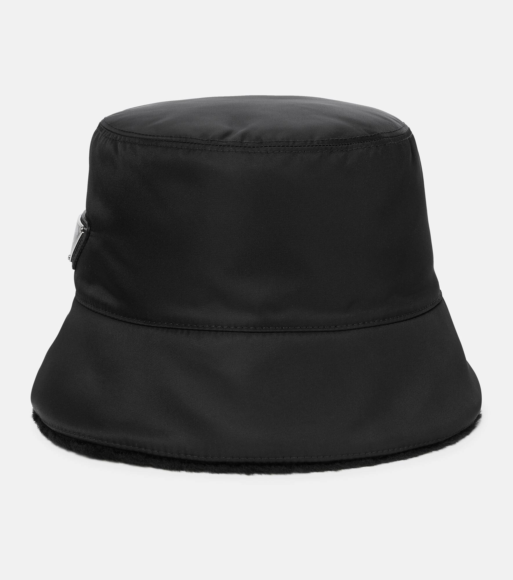 This Prada bucket hat transcends decades. It has a nostalgic '90s look, but its Re-Nylon fabrication – created from regenerated nylon – makes it modern. The classic black style is updated here with a triangle logo plaque and shearling lining. Product Details - Lining: 100% fur, fully lined - Care instructions: dry clean - Material: 100% polyamide - Made in Italy - Item number: P00588939 Size & Fit - Circumference size S 57cm-22.5" - Circumference size M 58cm-23" - Circumference size L 59cm-23" - Width of brim 7cm-3"