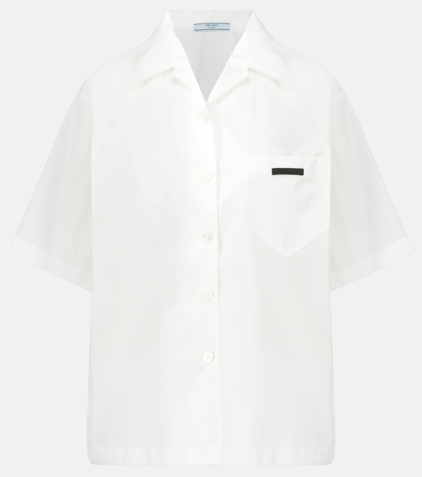 This white shirt is from Prada's Re-Nylon collection, a range of house-signature designs reimagined using fibers. Made in Italy, the gabardine style has an oversized silhouette with a revere collar, dropped shoulders, and a label at the chest pocket. Product Details - Made in Italy - Closure: buttoned front - Designer color name: White - Pockets: breast pocket - Care instructions: hand wash - Item number: P00528250 Size & Fit - True to size - Dropped shoulders - Semi-sheer - Oversized - Falls below the hip - The model seen in the picture is 178cm-5'10" and wearing a size IT 40
