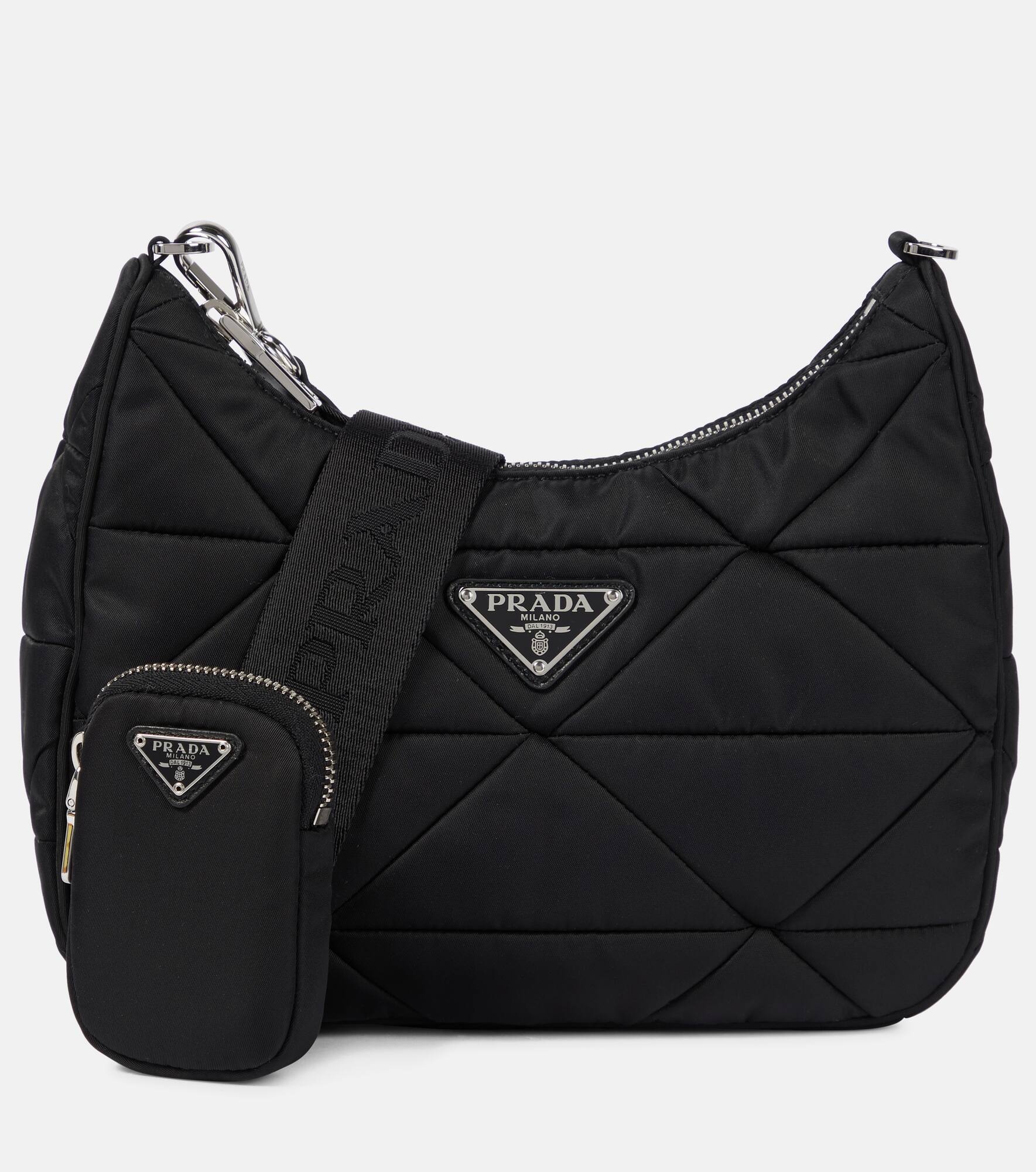 This black shoulder bag has triangular quilting as a nod to Prada's iconic emblem logo, which also takes pride of place at the front. Made in Italy from padded nylon, it has a curved silhouette with an adjustable logo-jacquard strap and coordinating pouch. Product Details - Material: fabric - Lining: fabric - Made in Italy - Designer color name: Nero - Detachable zipped pouch - Internal details: internal zipped pocket - Closure: zipped top - Detachable, adjustable shoulder strap - Color of strap: black - Includes: dust bag - Hardware color: silver - Item number: P00589232 Size & Fit - Min. height 16cm-6.5" - Max. height 19cm-7.5" - Max. width 24cm-9.5" - Depth 6cm-2.5" - Min. length shoulder strap 82cm-32.5" - Max. length shoulder strap 110cm-43.5" - Clutch height 10cm-4" - Clutch width 7cm-3"