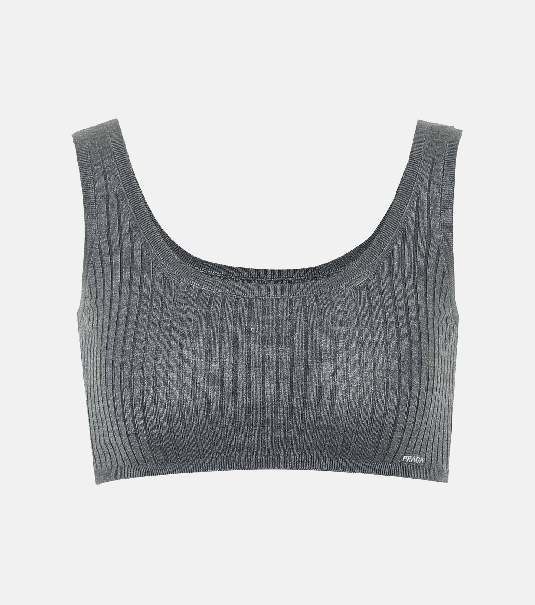Gracing the FW20 runway in a swathe of colors, this ribbed-knit, gray scoop-neck bra from Prada will be a versatile addition to your intimates. Spun from an ultra-soft stretch silk-blend, it's designed for long-lasting comfort. Let yours peep through the lapels of the label's nylon blazers. Product Details - Material: 80% silk, 13% polyamide, 4% elastane, 3% polyester - Care instructions: dry clean - Made in Italy - Designer color name: Dark Grey - Item number: P00513035 Size & Fit - True to size - Fitted - Cropped - The model seen in the picture is 178cm-5'10" and wearing a size IT 40