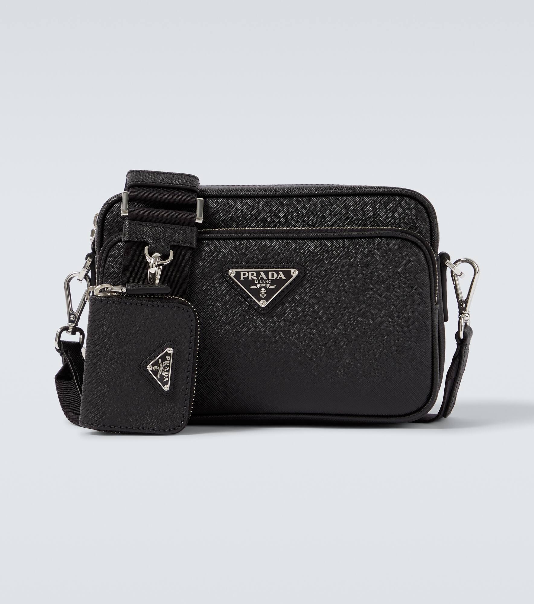 Prada's use of crosshatched Saffiano leather can be traced back to Mario Prada, who valued its sophistication and durability. Admire those qualities in this shoulder bag and its matching pouch. Product Details - Material: leather - Lining: leather - Made in Italy - Designer color name: Black - Item color: black - Detachable zipped pouch - Internal details: internal slot pocket - Closure: zipped top - Detachable, adjustable shoulder strap - Includes: dust bag - Item number: P01076002 Size & Fit - Height 13,5cm-5.5" - Width 21cm-8.5" - Depth 6.5cm-2.5" - Adjustable shoulder strap - Max. length shoulder strap 132cm-52"