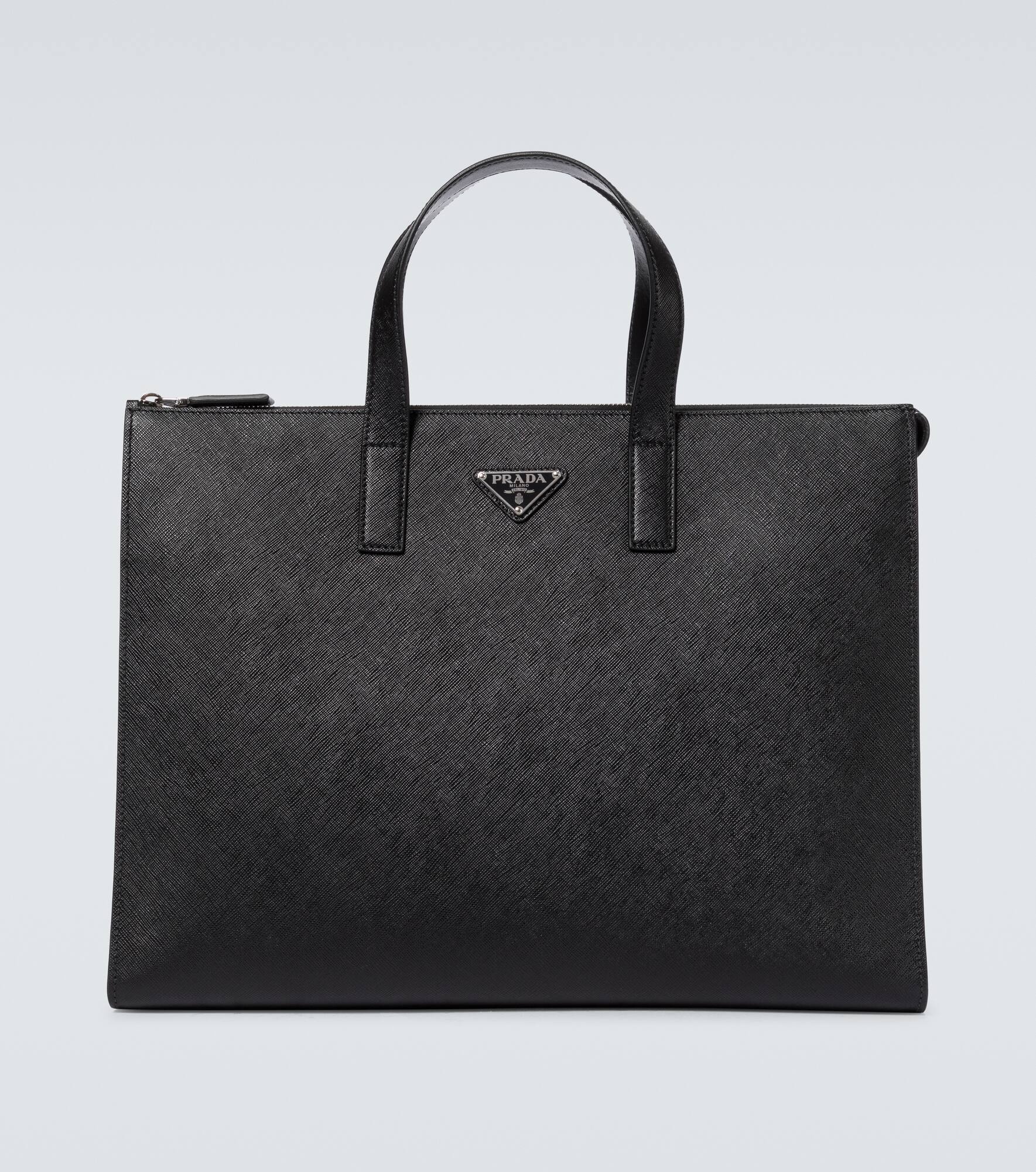 In Prada's signature saffiano leather finish, this black tote bag sports the labels triangle enamel logo on the front, with two handles, and a zipped fastening. Product Details - Material: calf leather - Lining: calf leather - Made in Italy - Designer color name: Nero - Item number: P00521922 Size & Fit - Height 30cm-12" - Width 40cm-15.5" - Depth 10cm-4" - Length of handles 33cm-13"