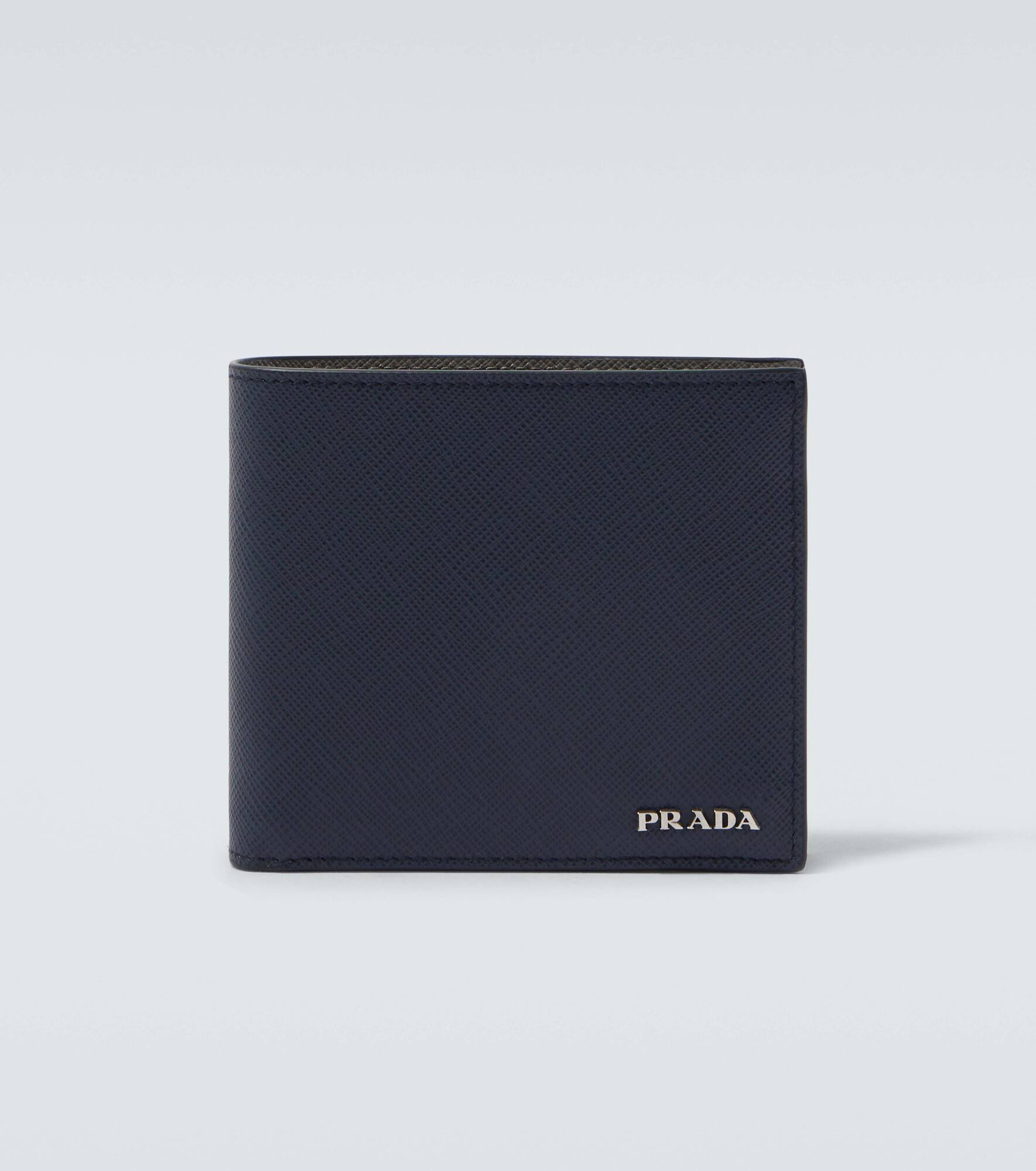 Prada's use of crosshatched Saffiano leather can be traced back to Mario Prada, who valued its sophistication and durability. This wallet is made from the signature material and features several card slots and a coin pouch. Product Details - Material: leather - Lining: leather, fabric - Made in Italy - Designer color name: Blue - Item color: blue, gray - Internal details: Card slots, snap-buttoned coin pocket, two internal compartments - Item number: P01083949 Size & Fit - Height 9,5cm-3.5" - Width 11cm-4.5"