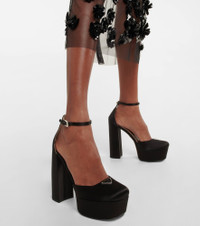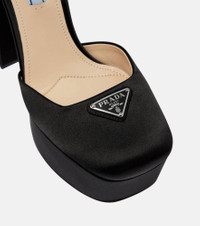 Made from satin, these pumps from Prada are destined for decadent evening wear. The vertiginous style features platform soles and block heels, and is finished with triangular logo plaques atop the square toes. Product Details - Upper: satin - Lining: leather - Sole: leather insole, leather and rubber sole - Toe shape: square toe - Made in Italy - Includes: shoe box - Designer color name: Nero - Closure: buckle-fastening ankle strap - Hardware color: silver - Item number: P00720583 Size & Fit - Fits slightly large to size - we recommend trying a half size smaller - European sizes - 14cm-5.5" heel (size EU 38) - 4,5cm-2" platform (size EU 38)