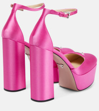 Elevate your footwear edit with Prada’s platform pumps in this season’s hit-hue. Made in Italy from lustrous satin, the pair sit atop platform soles and block heels, accented with the label’s iconic triangle logo. Product Details - Upper: fabric - Lining: leather - Sole: leather insole and sole - Toe shape: round toe - Made in Italy - Includes: shoe box - Designer color name: Begonia - Closure: ankle strap - Hardware color: silver - Item number: P00720590 Size & Fit - Fits slightly large to size - we recommend trying a half size smaller - European sizes - 14cm-5.5" heel (size EU 38) - 4,5cm-2" platform (size EU 38)