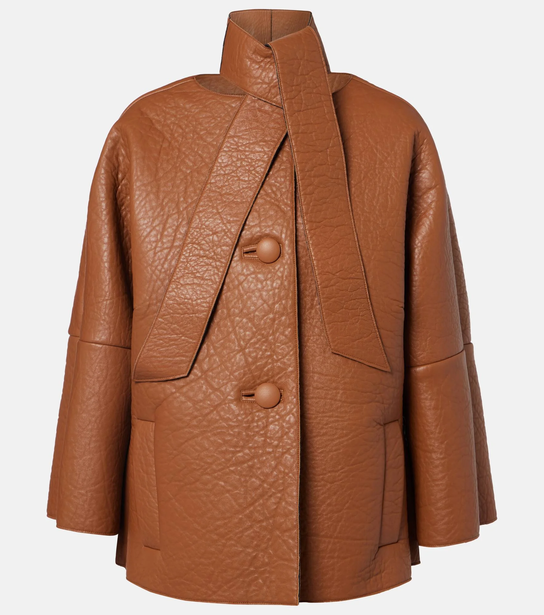 Prada embodies modern sophistication, blending timeless Italian craftsmanship with an innovative spirit. Crafted from soft nappa leather, this minimalist jacket features a rounded, oversized silhouette and a matching scarf. Product Details - Material: 100% lamb leather - Care instructions: specialist clean - Made in Italy - Designer color name: Brown - Item color: brown - Lining: 65% wool, 35% polyester - Pocket lining: 100% viscose - Closure: buttoned front - Pockets: welt pockets - Includes: garment bag - Item number: P01117244 Size & Fit - True to size - Oversized - Non-stretchy fabric - Falls below the hip - Height of model is 175cm-69" and wears a size IT 40