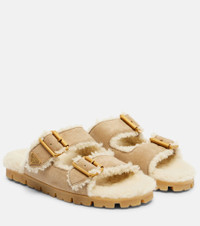 These sandals from Prada showcase a smooth suede construction, complemented by shearling trims and a soft lining for all-day comfort. The design is fitted with gold-toned buckles and signature logo plaques on the straps. Product Details - Upper: calf leather (suede) - Lining: shearling - Sole: shearling insole, rubber sole - Color: beige - Toe shape: round open toe - Made in Italy - Includes: dust bag, shoe box - Designer color name: Neutral - Trim: shearling - Hardware color: gold - Item number: P01119320 Size & Fit - True to size - European sizes - 2cm-1" platform