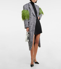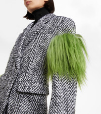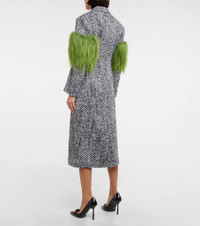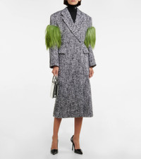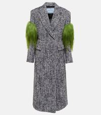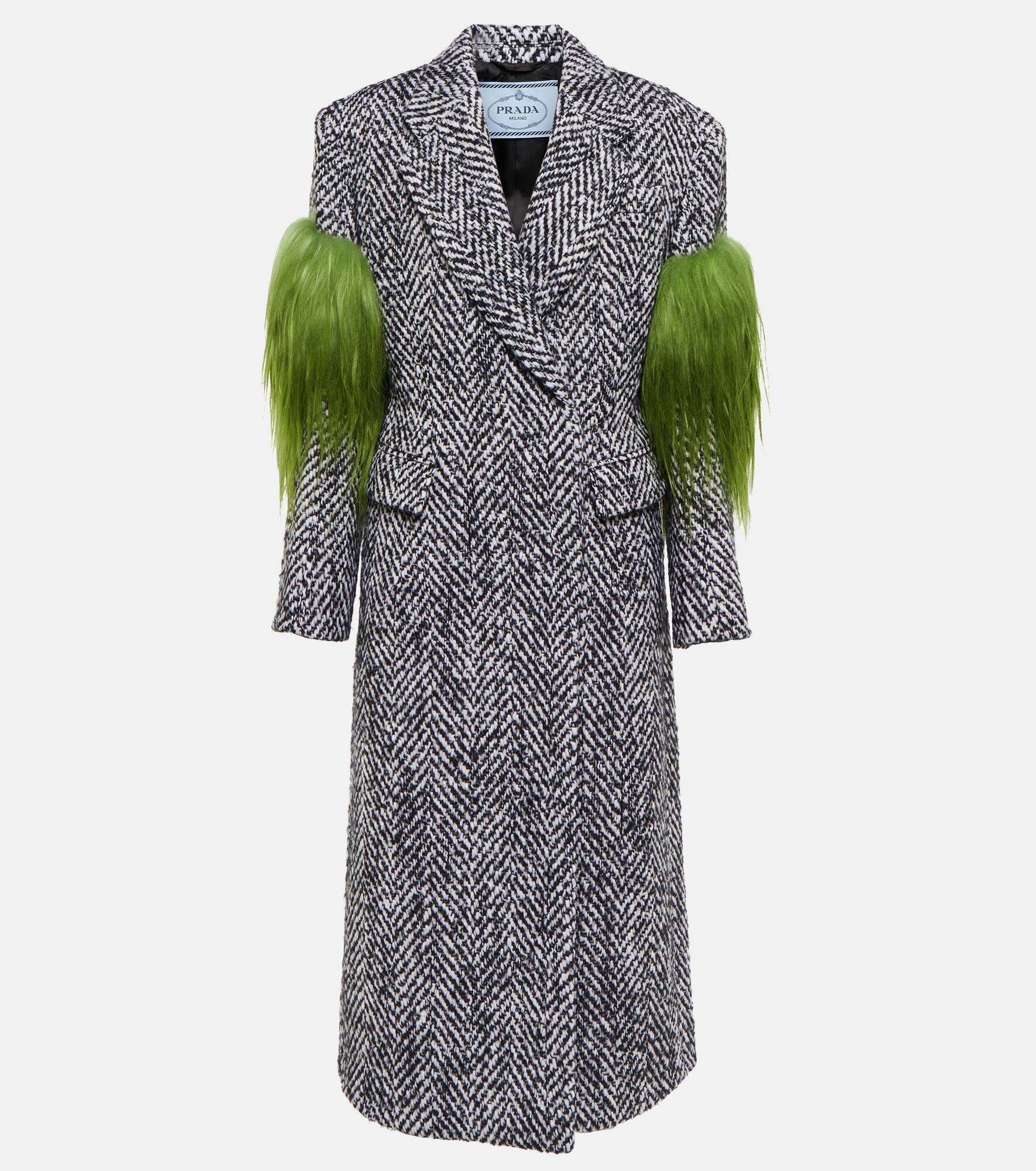 Walk this Prada coat straight from the runway and into your edit. The double-breasted design is made from a blend of wool and mohair to a calf-length silhouette that is trimmed with bold green shearling. Product Details - Made in Italy - Pockets: breast pocket, flap pockets - Contains non-textile parts of animal origin - Designer color name: Nero+Talco - Material: 84% wool, 11% mohair, 5% polyamide - Lining: 100% cupro, fully lined - Closure: double-breasted buttoned front - Care instructions: dry clean - Item number: P00726426 Size & Fit - Fits large to size - we recommend trying one size smaller - Oversized shoulders - Shoulder pad inserts - Cinched waist - The model seen in the picture is 178cm-5'10" and wearing a size IT 38