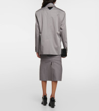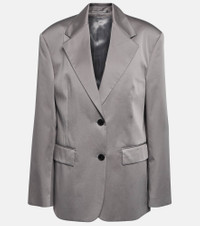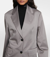 This single-breasted blazer from Prada is made in Italy from pure cotton. The boxy design is fully lined and features the brand's iconic triangle logo as a patch on the back of the neck. Product Details - Lining: 100% viscose, fully lined - Made in Italy - Pockets: faux pockets - Designer color name: Acciaio - Care instructions: dry clean - Material: 100% cotton - Contains non-textile parts of animal origin - Item number: P00787001 Size & Fit - True to size - Shoulder pad inserts - Designed for a loose fit - Falls below the hip - The model seen in the picture is 178cm-5'10" and wearing a size IT 40