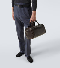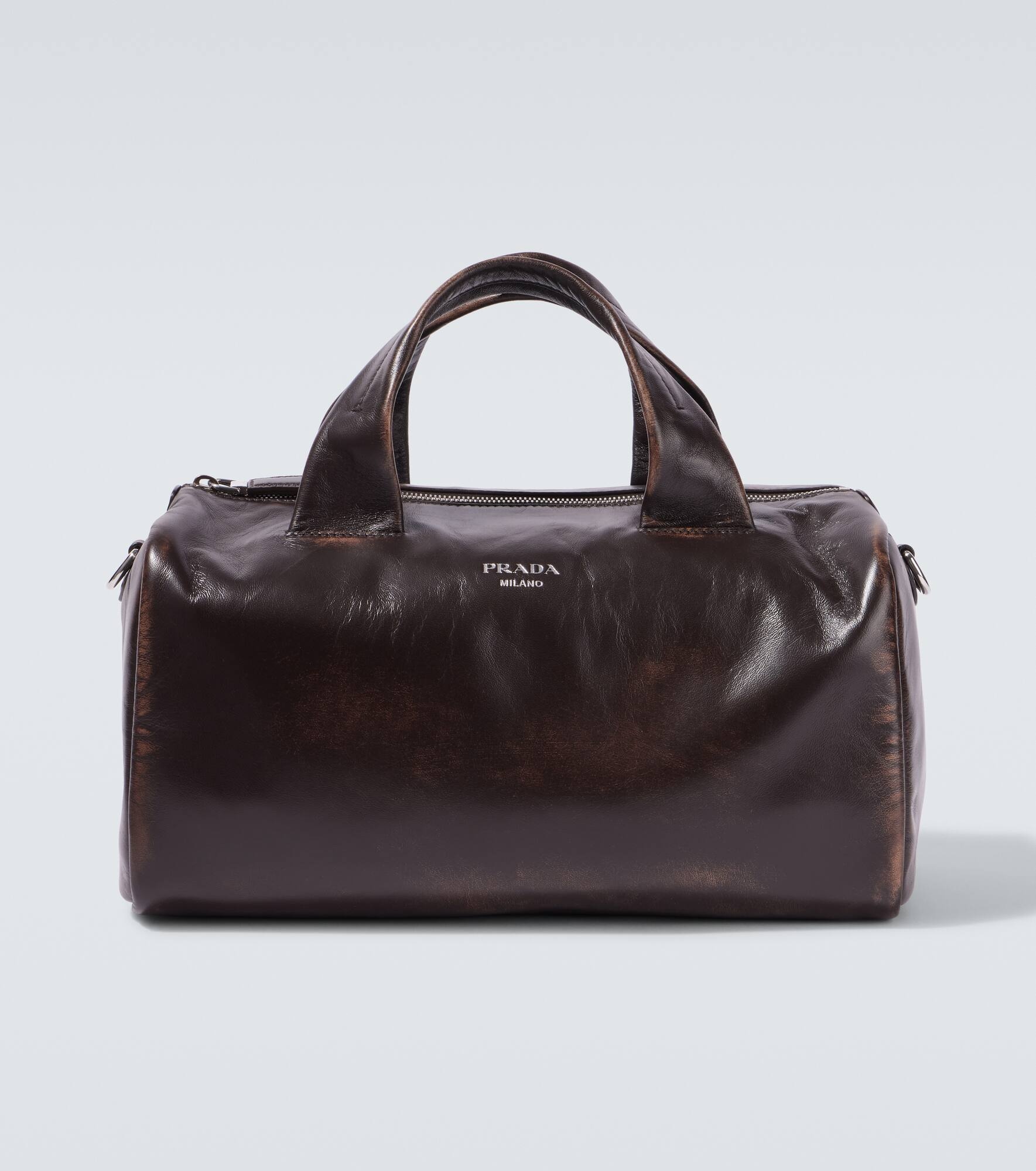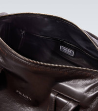 Prada takes Italian heritage into a distinctly modern direction with a streamlined and fashion-forward approach. For all your on-the-go needs, this duffel bag is made in Italy from polished leather and comes with a detachable shoulder strap. Product Details - Material: leather - Lining: leather - Made in Italy - Designer color name: Brown - Closure: zipped top - Top handles, Adjustable shoulder strap - Internal details: internal zipped pocket - Hardware color: silver - Includes: dust bag - Item number: P01008259 Size & Fit - Height 17,5cm-7" - Width 35,5cm-14" - Depth 18cm-7" - Length of handles 34cm-13.5" - Min. length shoulder strap 106,5cm-42" - Max. length shoulder strap 118cm-46.5"
