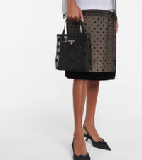 Prada's longstanding love of mesh is updated with this sequined polka-dot tote. The semi-sheer small-sized design features brushed calfskin leather trims and houses a practical pouch. Triangular logo plaques, meanwhile, lend unmissable recognition. Product Details - Trim: calf leather, fabric - Designer color name: Nero - Detachable zipped pouch - Internal details: fabric lining, leather lining - Made in Italy - Top handles - Closure: open top - Item number: P00627881 Size & Fit - Height 22cm-8.5" - Width 21cm-8.5" - Depth 8cm-3" - Clutch height 11,5cm-4.5" - Clutch width 17cm-6.5"