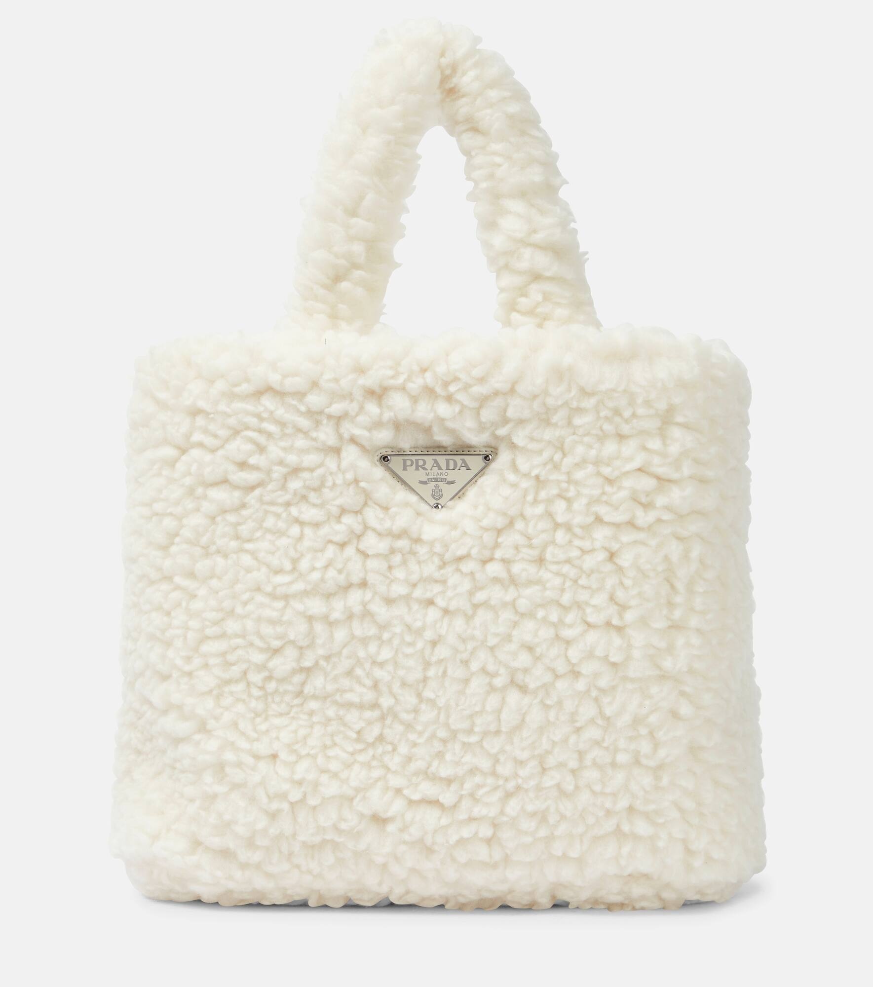 This small tote from Prada is made with soft teddy wool and cashmere blend for a tactile finish. An interior zipped pocket and a removable shoulder strap make this piece both practical and stylish. Product Details - Material: fabric - Detachable, adjustable shoulder strap, Top handles - Designer color name: Naturale - Internal details: internal zipped pocket, fabric lining - Made in Italy - Comes with dust bag - Closure: open top - Item number: P00696078 Size & Fit - Height 26cm-10" - Width 32cm-12.5" - Depth 17cm-6.5" - Length of handles 40cm-15.5" - Min. length shoulder strap 89cm-35" - Max. length shoulder strap 132cm-52"
