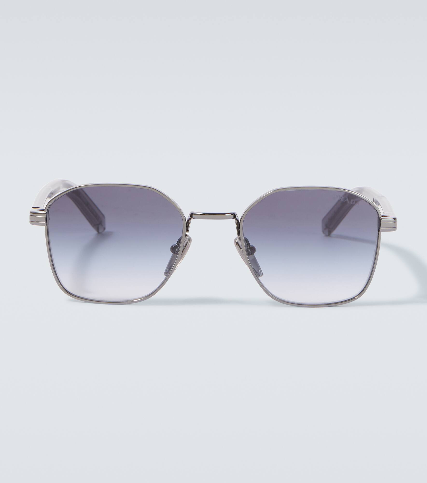 Elevate everyday ensembles with modern eyewear, like these square sunglasses from Prada. They feature slim, metal frames complemented by hexagonal lenses and logo lettering on the temples. Product Details - Frame material: metal, acetate - Frame color: silver - Lens filter category 2 - Lens color: blue - Made in Italy - Includes: case, cleaning cloth - The color of the case may vary - Item number: P01110750 Size & Fit - Lens width: 51mm-2" - Bridge size: 20mm-0.8" - Earpiece length: 145mm-5.7"