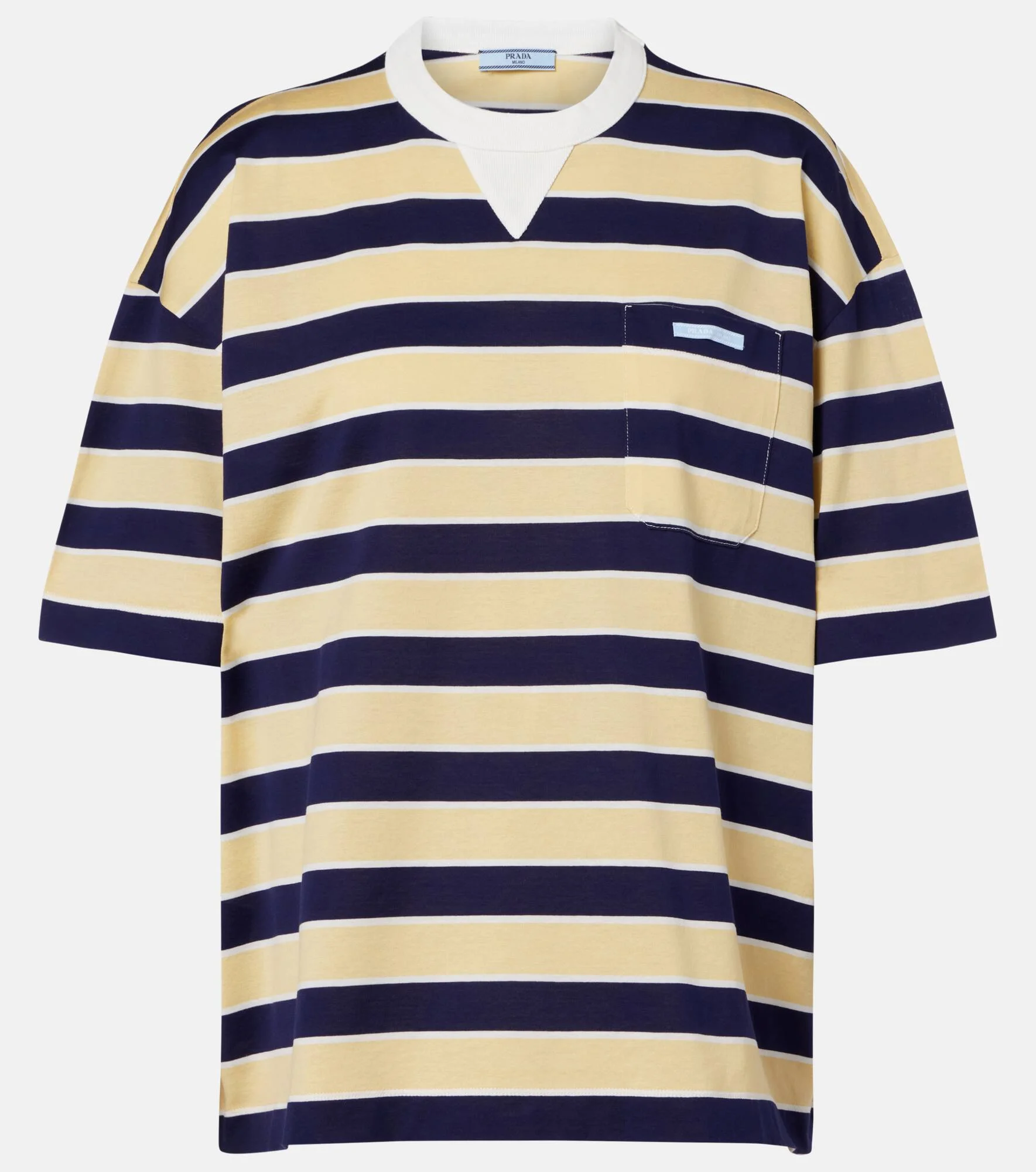 Prada takes Italian heritage into a distinctly modern direction with a streamlined and fashion-forward approach. This T-shirt is made from cotton jersey and finished with a striped motif. Product Details - Material: 100% cotton - Care instructions: hand wash cold - Made in Romania - Color: blue - Designer color name: Blu+Crema - Collar: crewneck - Pockets: breast pocket - Item number: P01154856 Size & Fit - True to size - Dropped shoulders - Oversized - Slightly stretchy fabric - Falls below the hip - The model seen in the picture is 178cm-5'10" and wearing a size IT 40