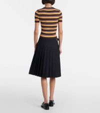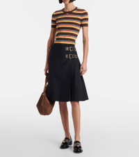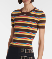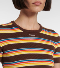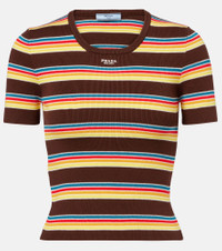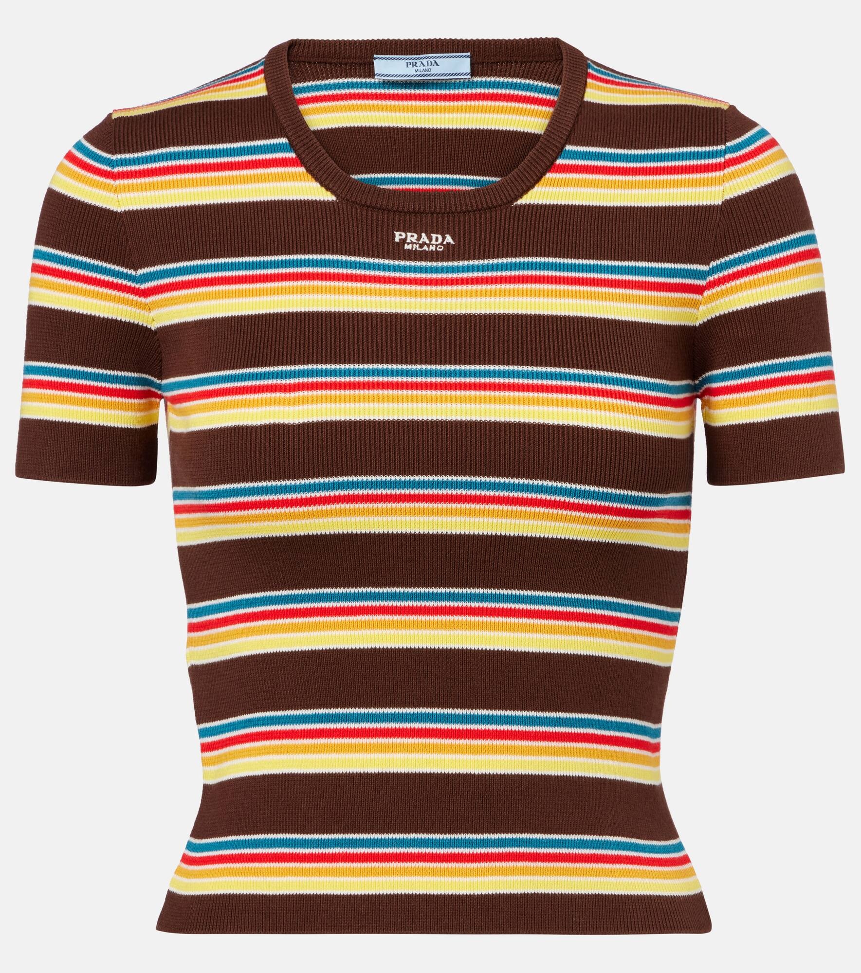 Prada takes Italian heritage into a distinctly modern direction with a streamlined and fashion-forward approach. Striking a vibrantly striped pattern, this ribbed-knit T-shirt is made of pure cotton, offering a breathable fit and versatile look. Product Details - Material: 100% cotton - Care instructions: dry clean - Made in Italy - Designer color name: Cacao - Item color: brown, multicolor - Item number: P01009357 Size & Fit - True to size - Fitted - Slightly stretchy fabric - Cropped - The model seen in the picture is 178cm-5'10" and wearing a size IT 40