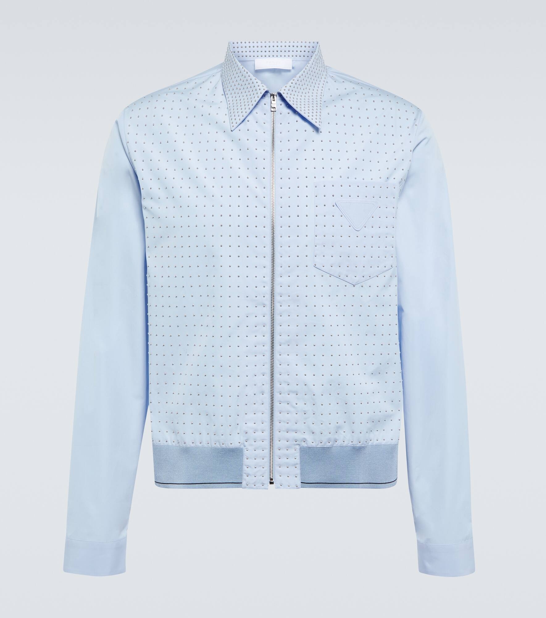 This blouson jacket from Prada is detailed with all-over metal appliqued studs, offering a contemporary take on a classic silhouette. Made from crisp cotton, the design features a logo patch and ribbed knit hemline. Product Details - Details: 52% nylon, 42% polyamide, 6% elastane - Made in Italy - Care instructions: machine wash at 30 degrees - Designer color name: Cielo - Pockets: breast pocket - Buttoned cuffs - Closure: zipped front - Material: 100% cotton - Item number: P00748828 Size & Fit - True to size - For a looser fit, we recommend taking one size up - Without pleats in the back - Straight fit - Slightly cropped - The model in the picture is 185cm-6'1" and wearing a size M