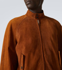 Subtly treated suede lends a distinctive touch to this bomber jacket from Prada. It features a stand-up collar, ribbed-knit cuffs, and is finished with a triangle logo at the back which adds subtle brand recognition. Product Details - Material: 100% leather - Care instructions: specialist clean - Made in Italy - Designer color name: Caramel - Comes with garment bag - Closure: zipped front - Lining: 100% viscose - Pockets: buttoned pockets - Item number: P01009724 Size & Fit - True to size - Straight fit - Elasticated hem - Non-stretchy fabric - Slightly cropped - The model in the picture is 185cm-6'1" and wearing a size IT 50