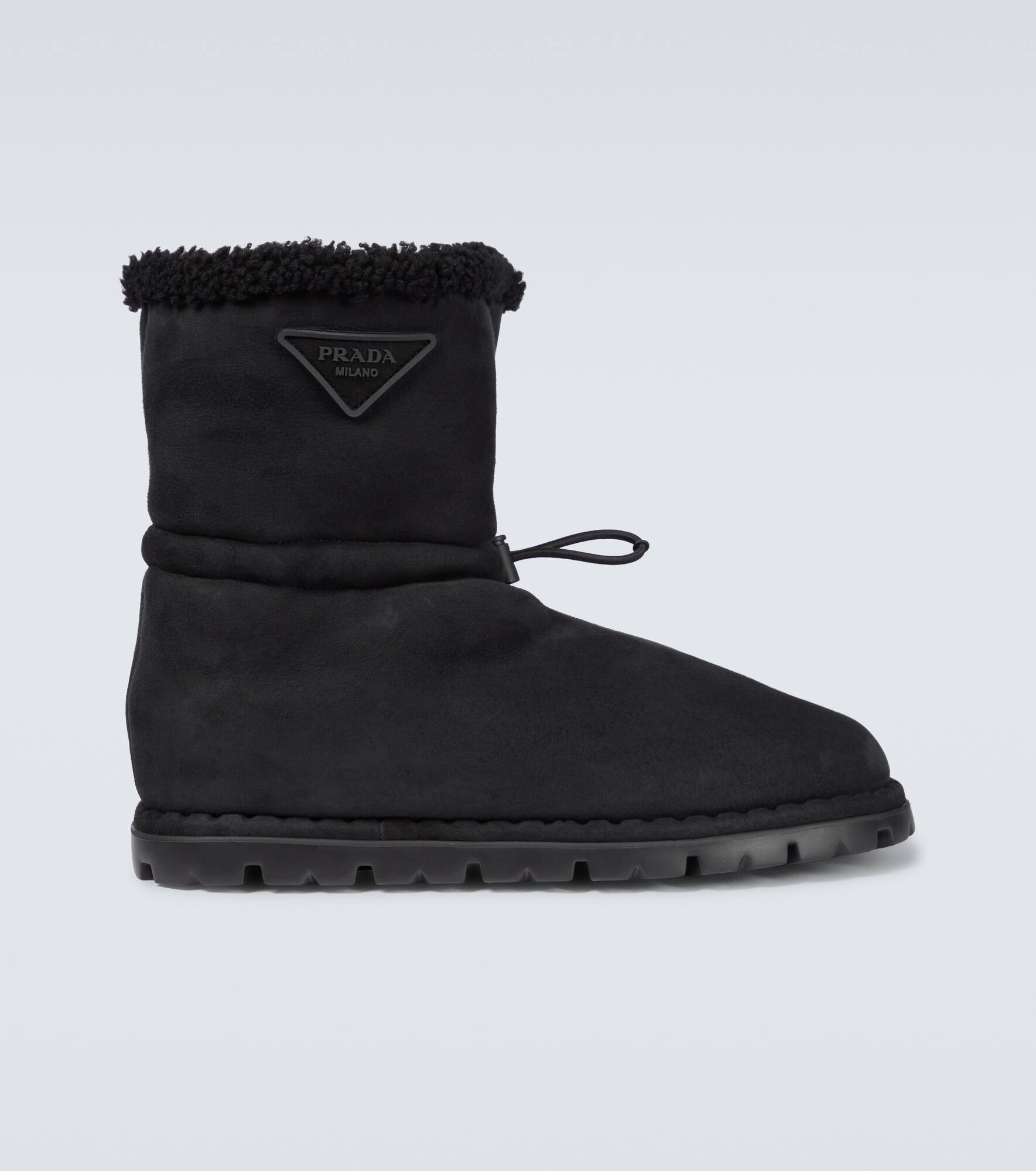 With a smooth suede finish, these Prada boots are crafted entirely from leather. Italian-crafted in black, these soft boots have a shearling lining, drawstring for an adjusted fit, and are detailed with the label's triangle logo on either side. Product Details - Lining: shearling - Toe shape: round toe - Upper: shearling - Closure: elasticated strap - Sole: shearling insole, rubber sole - Designer color name: Nero - Made in Italy - Item number: P00581421 Size & Fit - True to size - Half sizes please take the next size down - UK sizes