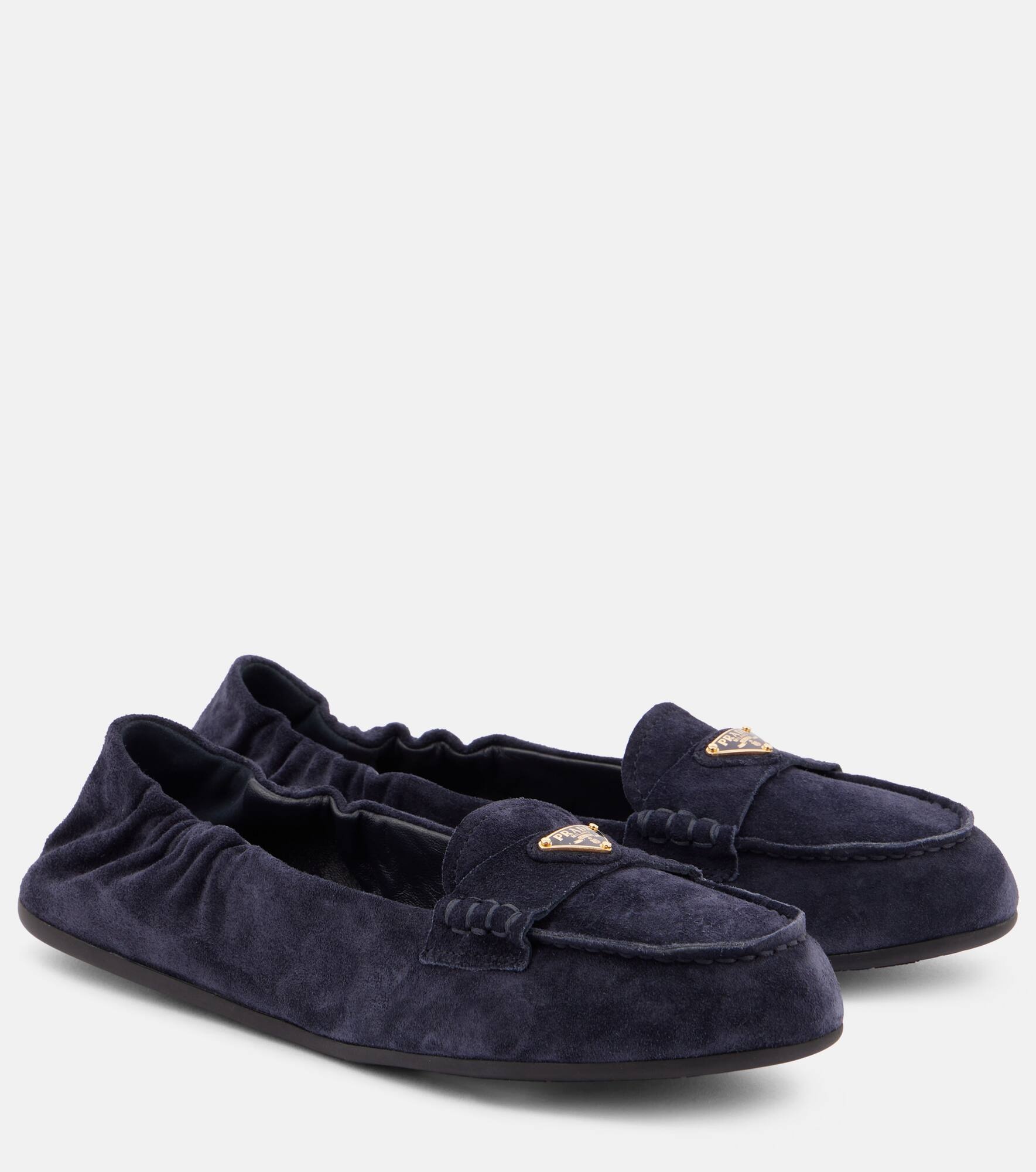 Opt for these loafers from Prada when building your capsule wardrobe. The style is crafted from supple navy suede with uppers adorned with the brand’s iconic logo and elasticated heel counters for optimal comfort. Product Details - Upper: leather (suede) - Lining: leather - Sole: leather insole, rubber sole - Toe shape: round toe - Made in Italy - Includes: shoe box - Designer color name: Bleu - Hardware color: gold - Item number: P01010508 Size & Fit - True to size - Slightly narrow at the toe - European sizes
