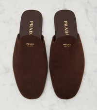 Prada takes Italian heritage into a distinctly modern direction with a streamlined and fashion-forward approach. Expertly crafted from velvety smooth suede, these mules are finished with golden logo detailing at the vamps. Product Details - Upper: calf leather (suede) - Lining: leather - Sole: leather insole, rubber sole - Toe shape: round toe - Made in Italy - Includes: dust bag, shoe box - Designer color name: Moro - Item color: brown - Item number: P01057679 Size & Fit - True to size - European sizes